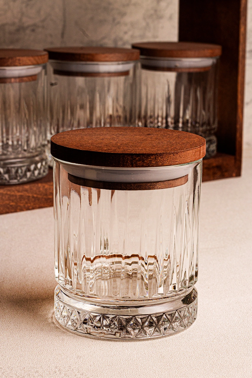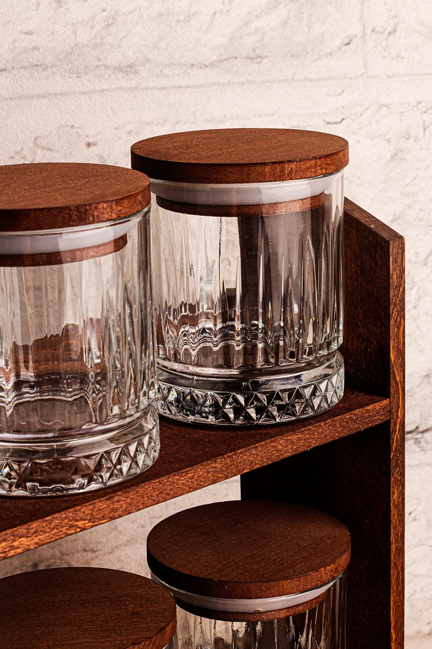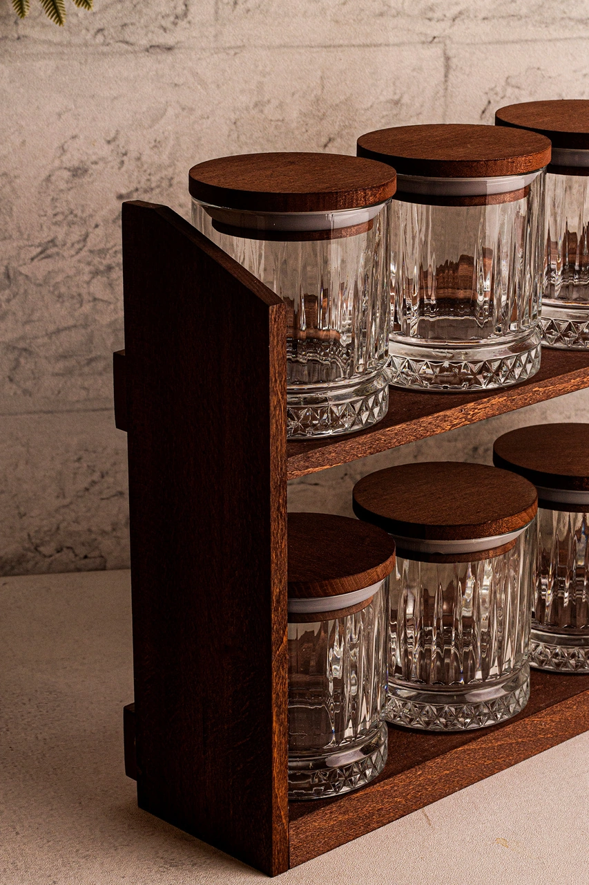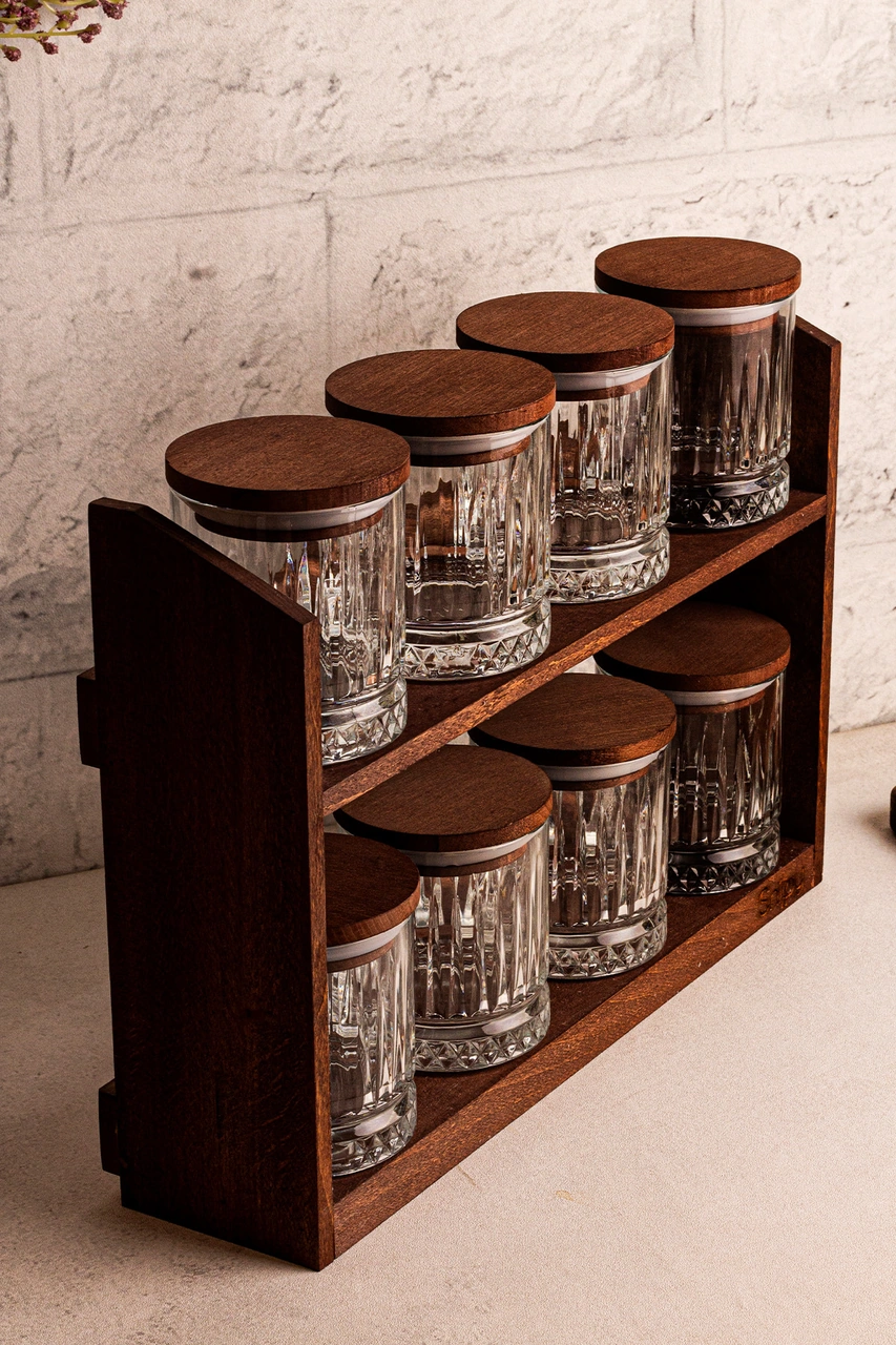 Mira Küçük - Standlı 8'li Vakumlu Ahşap Kapaklı Cam Baharatlık Takımı Saklama Kabı Seti 210 Ml Ahşap
