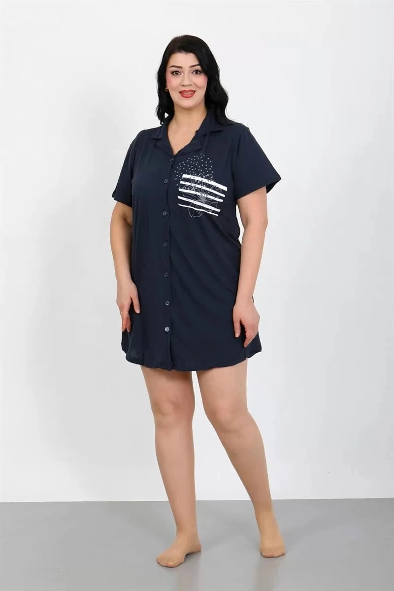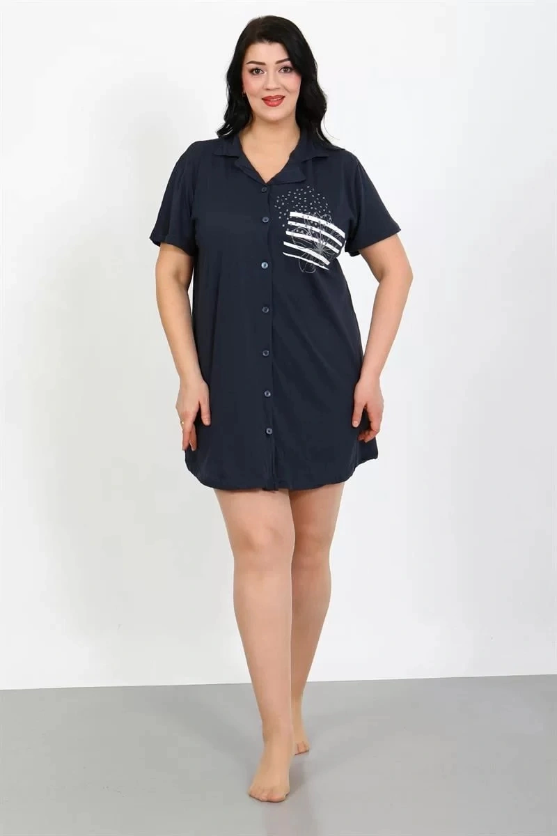 Moda Büyük Beden Penye Düğmeli Lacivert Tunik Gecelik Lacivert