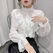Moda Fırfır Vintage Bluz Kadınlar Zarif Uzun Kollu Dantel Gömlek Gevşek Şifon Gömlek Standı Yaka Pilili Blusas Tops 15832 Beyaz