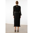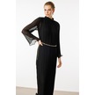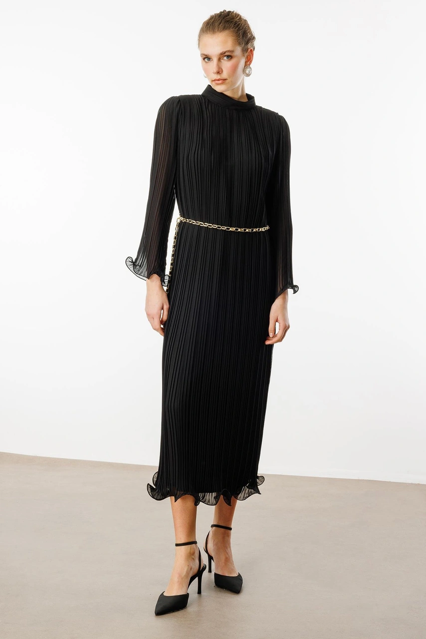 Moda İlgi Kadın Etek Ve Kol Ucu Volanlı Pliseli Zincir Kemerli Midi Boy Elbise 0060 Siyah Siyah