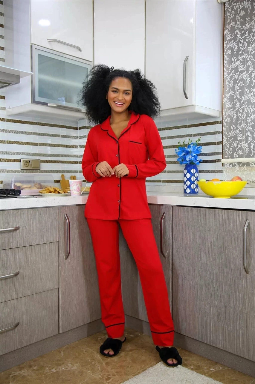 Moda Kadın %100 Pamuk Penye Önden Düğmeli Uzun Kol Pijama Takım Kırmızı Kırmızı