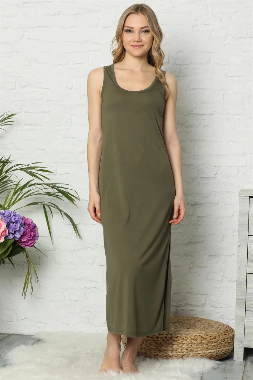 Moda Kalın Askılı Haki Penye Uzun Gecelik Haki