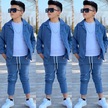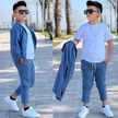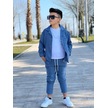 Modavals Kol Katlamalı Keten Gömlek & Beli Lastikli Keten Pantolon & Pamuklu Tshırt & Zincir Aksesuar 4lü Keten Erkek Çocuk Takım Mavi