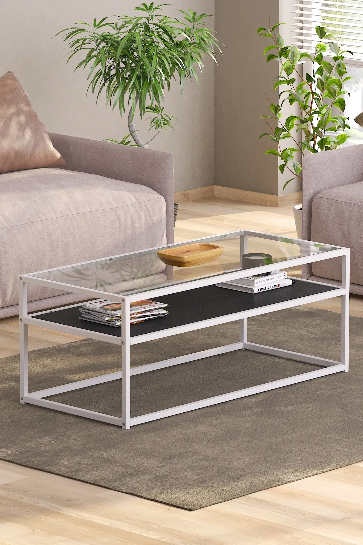 Modern Metal Iskeletli Temper Camlı 2 Katlı Dikdörtgen Orta Sehpa Siyah-beyaz-şeffaf