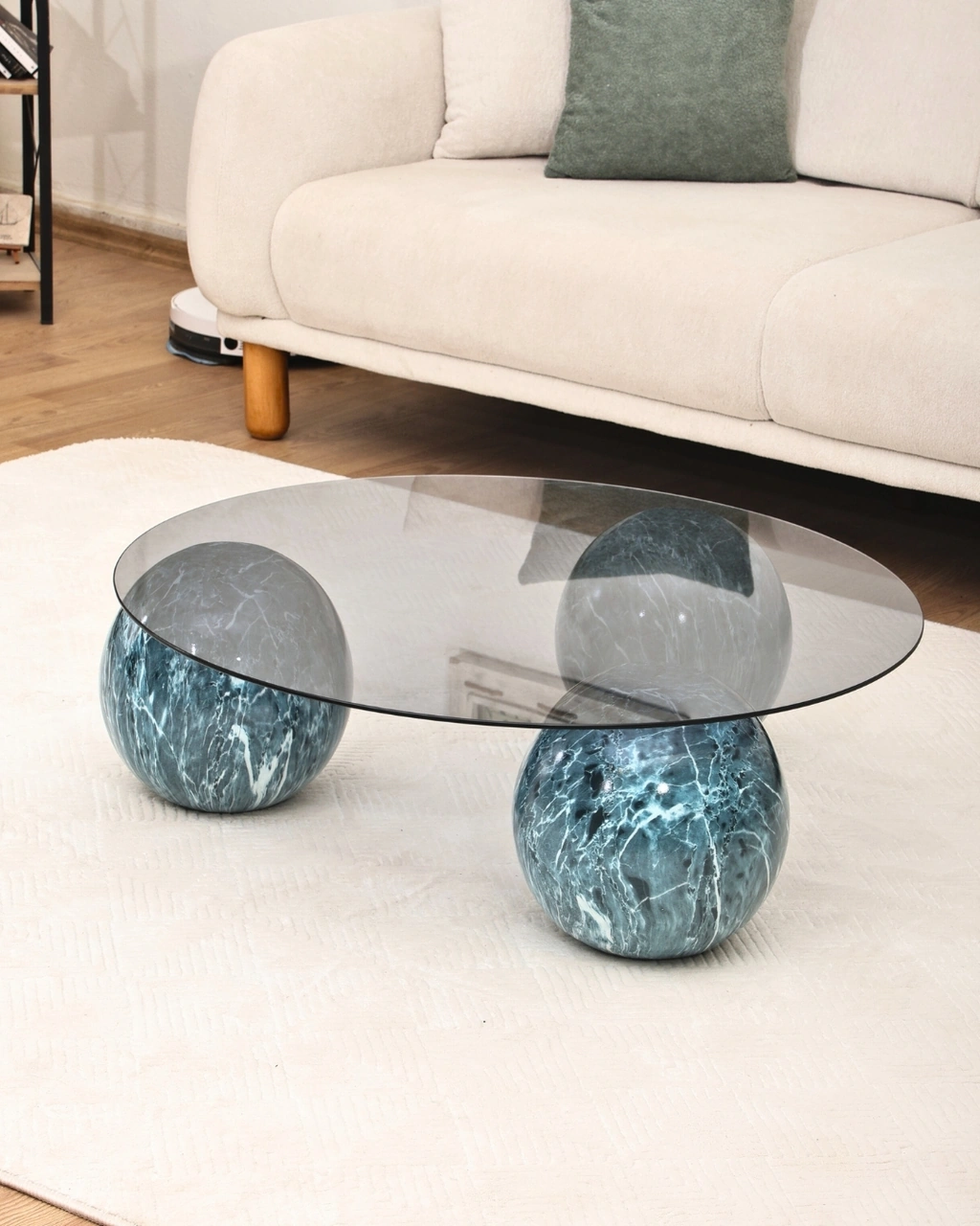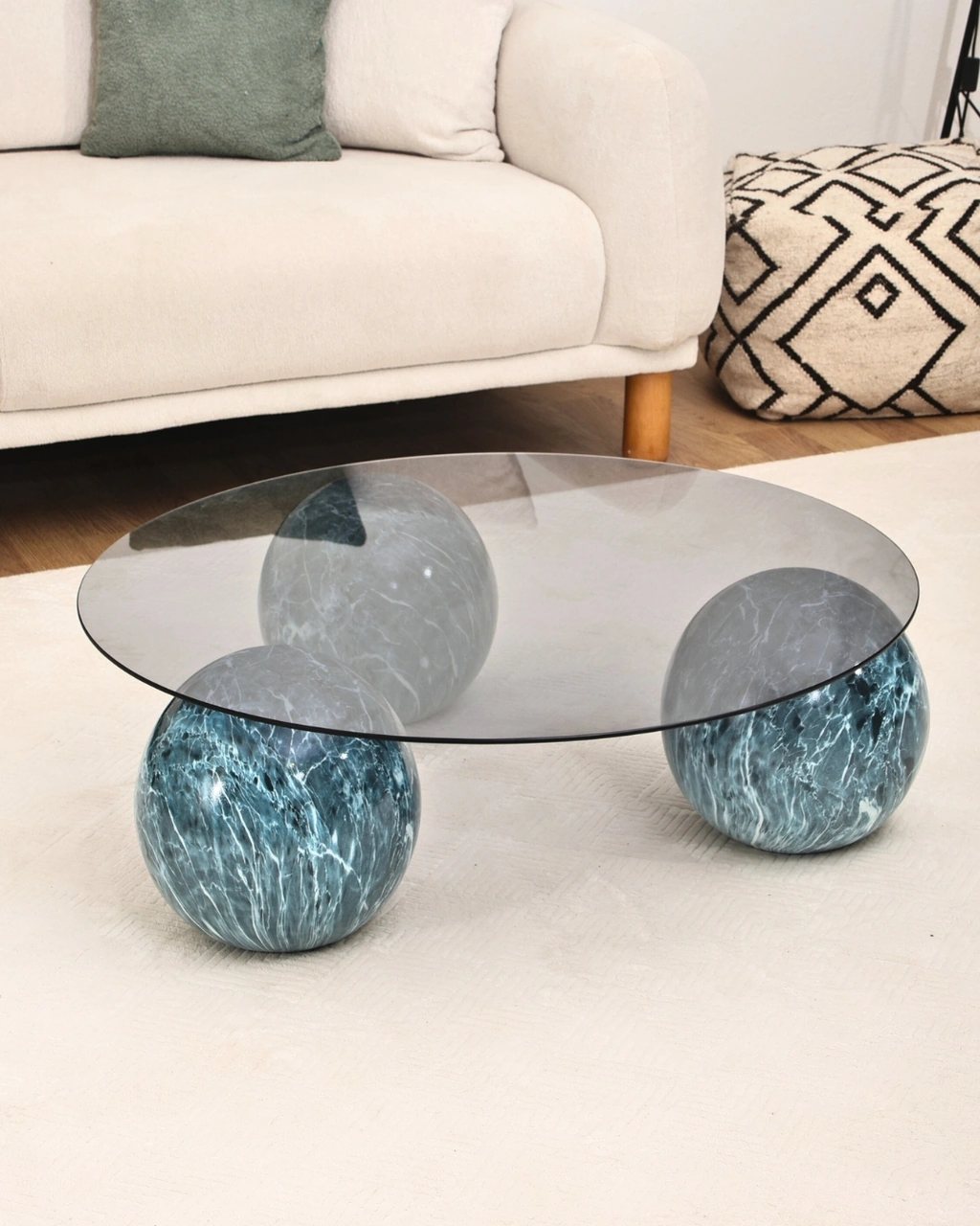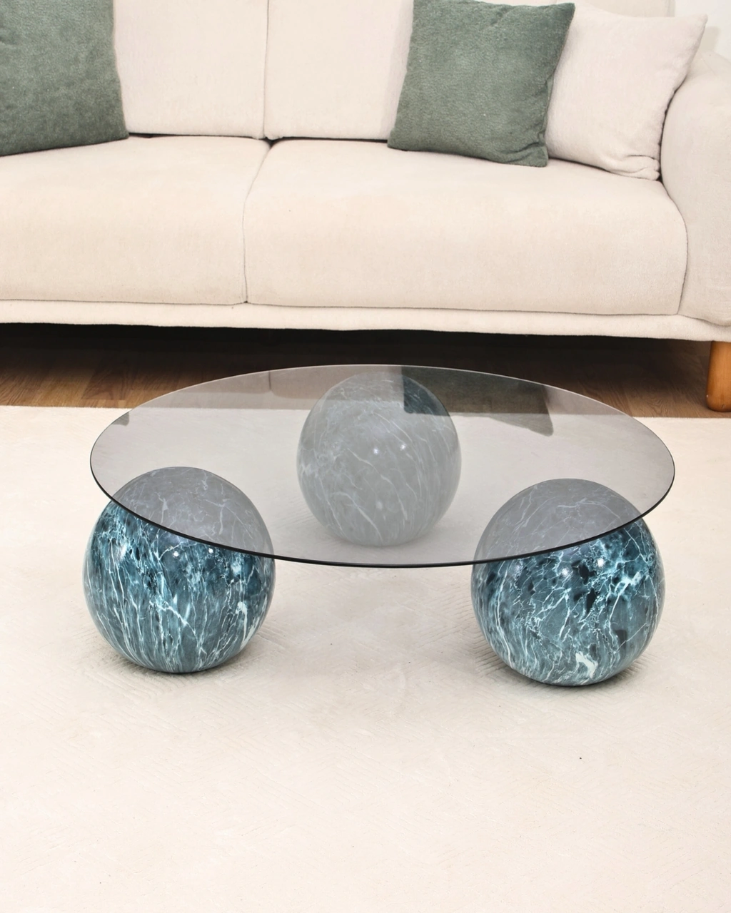 Modern Orta Sehpa & Küre Sehpa & Top Sehpa & Füme Yuvarlak Cam & Ocean Mavi