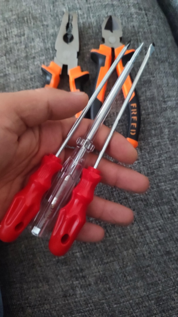 ürünlerin görseldeki paylaşılan ile alakası yok. penseler turuncu siyah. görselde kırmızı saplı. tornavidalar çok kalitesiz ve küçük. pensenin iki ucu kapatınca kayık duruyor. yan keski ile sert bişey kaseyim dedim tek el ile sıktım kesici bölümü ezildi. karga burnu idare eder ama güç deneyeceklere tavsiyem denemeyin. elinizde kalabilir.