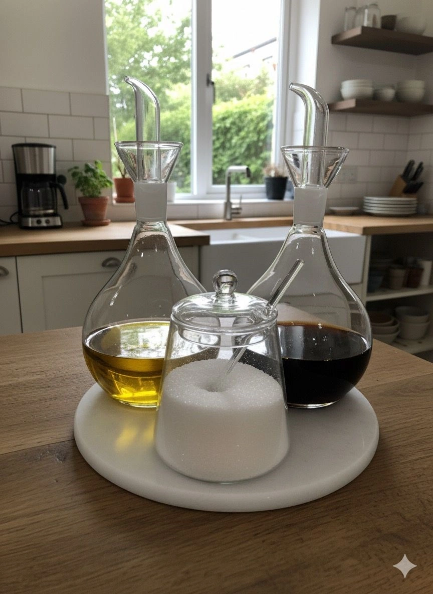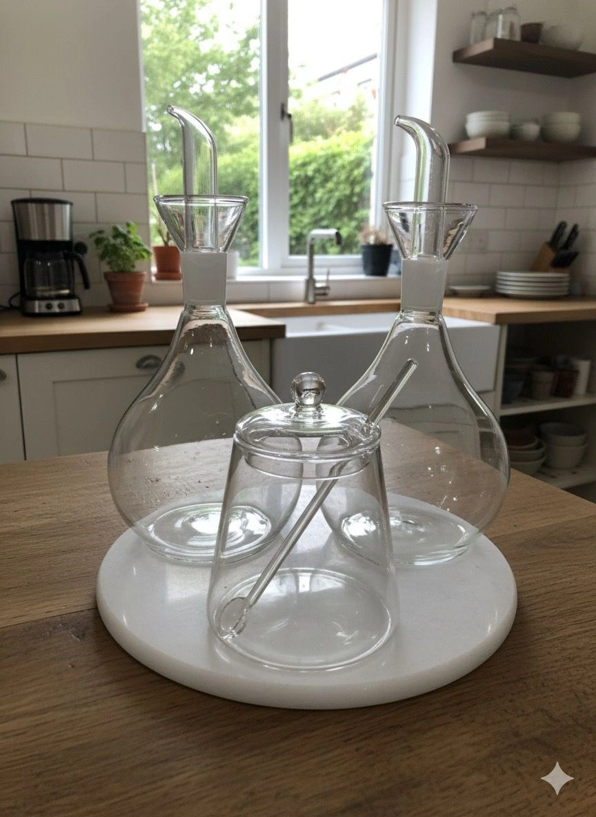 Morponi 3'lü Cam Yağlık Ve Tuzluk Seti Mermer Altlıklı Şık Sunum Tombul Düz Cam Yağdanlık Set Şeffaf