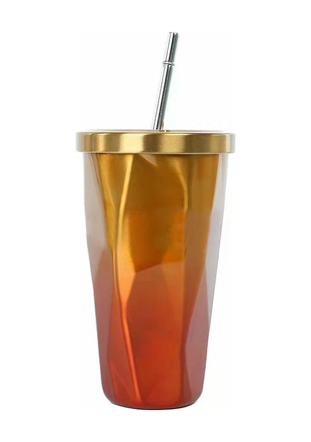 Neevoyu 500ml Çift Katlı Paslanmaz Çelik Matara, Yumuşak İçme Pipeti Ve Renkli Desen, Isı Saklama Özelliğiyle Su Bardakları Altın Turuncu