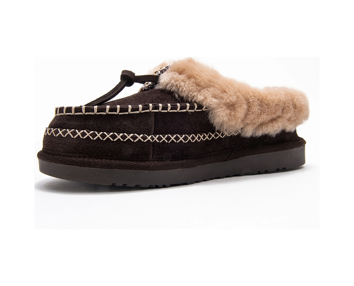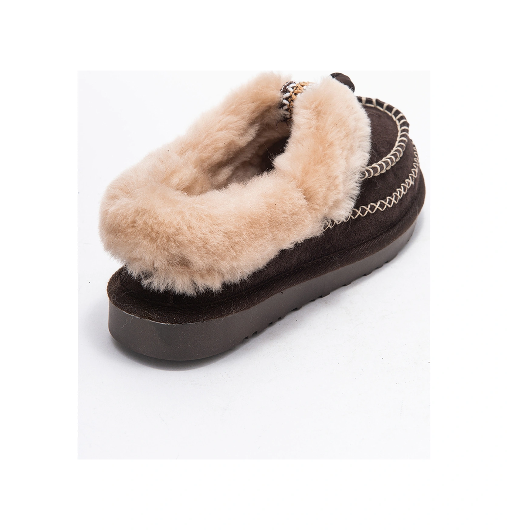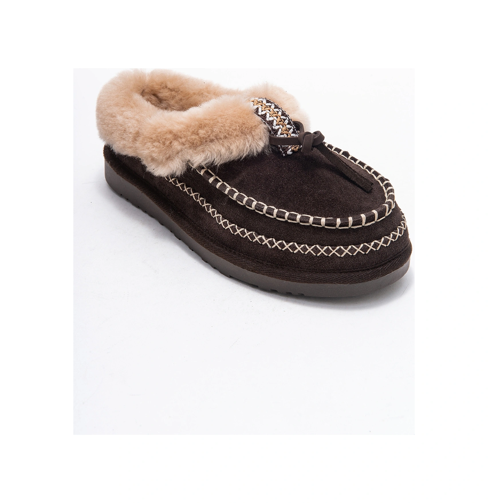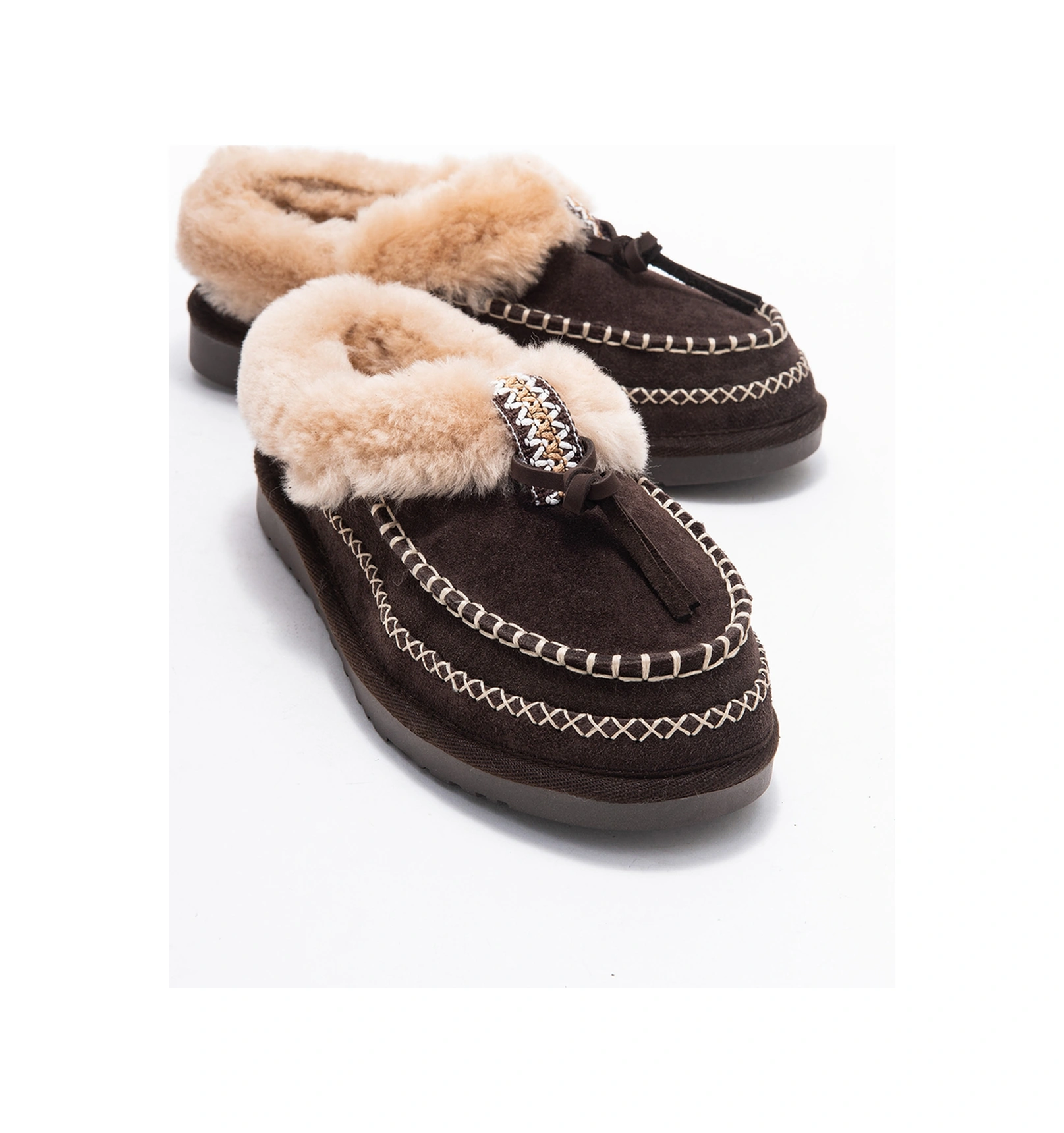 Norıel Kahverengi Süet Hakiki Deri Dikişli Kürklü Kadın Makosen Terlik Kahverengi