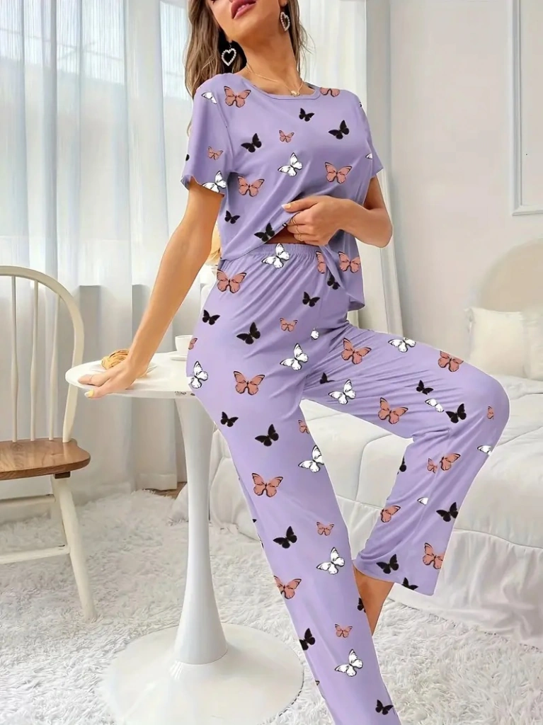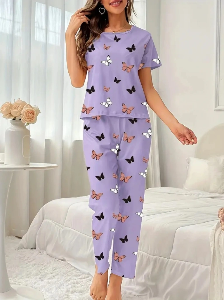 Nova Bazaar Kadın Kısa Kollu Bisiklet Yaka Kelebek Baskılı Süprem Ikili Takım Mor