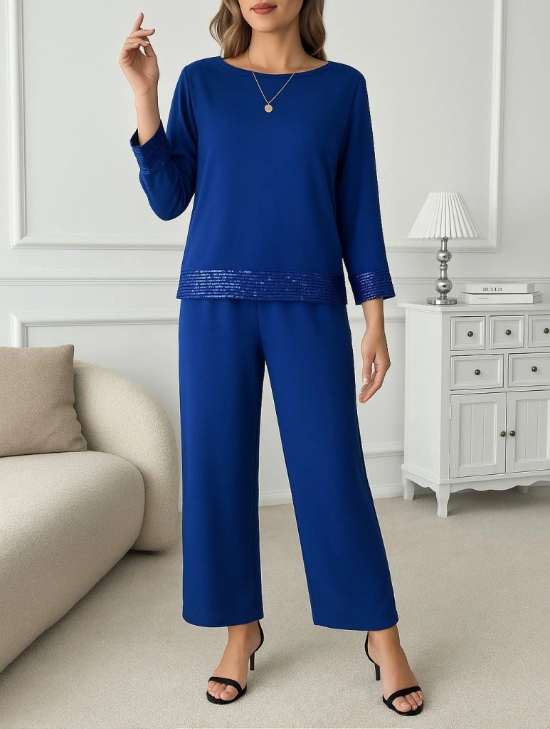 Nova Bazaar Kadın Uzun Kollu Bisiklet Yaka Pulpayetli Viskon Iki Iplik Bluz Ve Pantolon Ikili Takım Lacivert