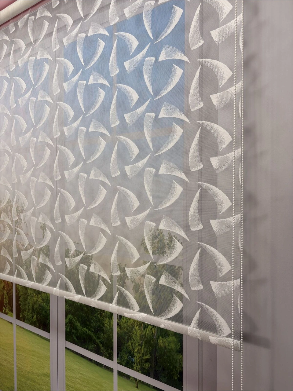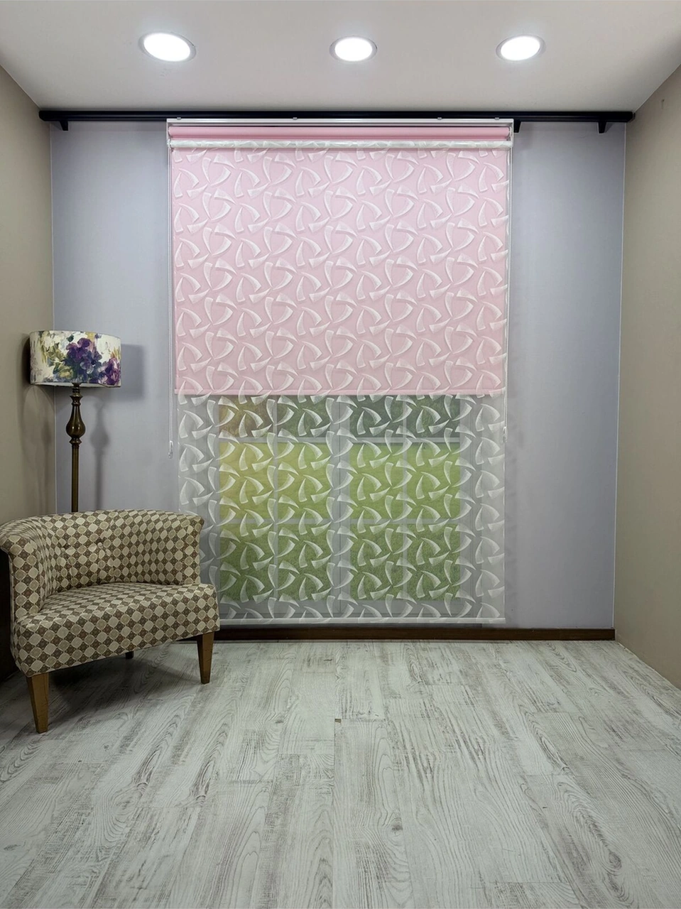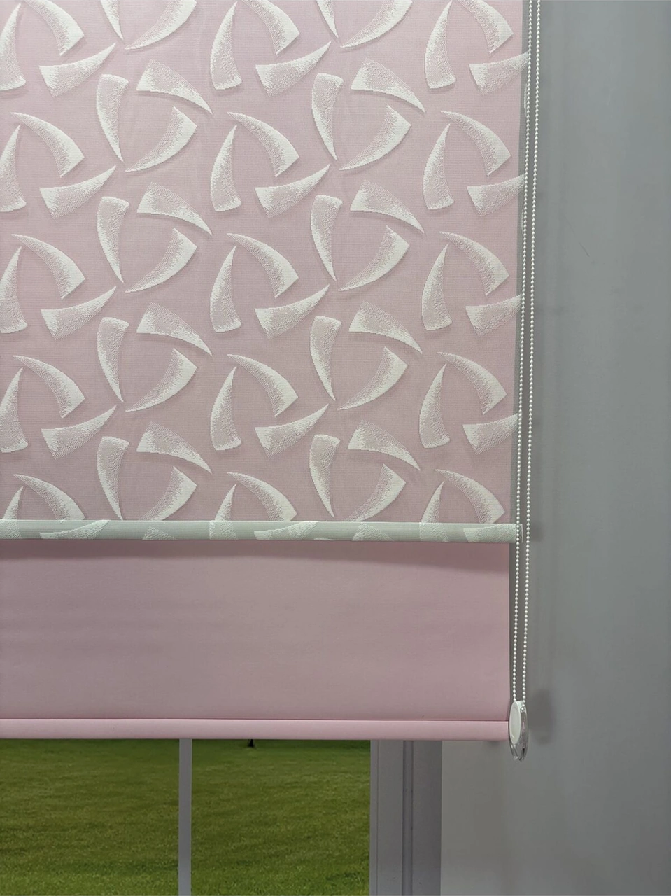 Nova Serisi Üç Yaprak Desenli Çift Mekanizmalı Beyaz Tül Pembe Stor Perde Pembe