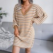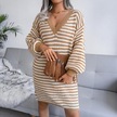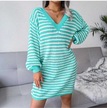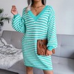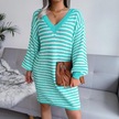 Novahub Kadın Sonbahar Kış V Boyun Uzun Kollu Yün Elbise - Camgöbeği Renkli Şerit Oyma Camgöbeği