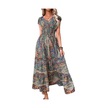 Novahub Yaz Derin V Yaka Kısa Kollu Maxi Elbise Bohemia Renkli Baskı Elastik Yüksek Bel Fırfır Dikiş Hem A-line Plaj Elbisesi Yeşil - L Yeşil