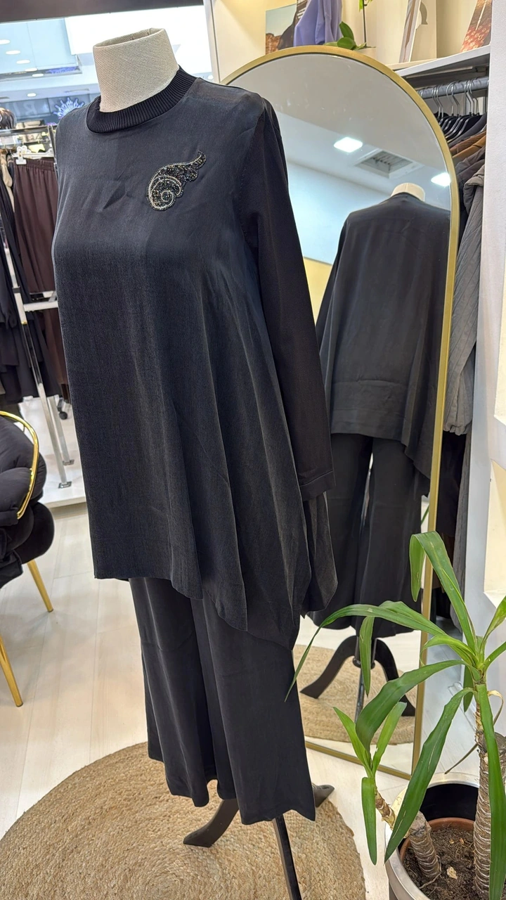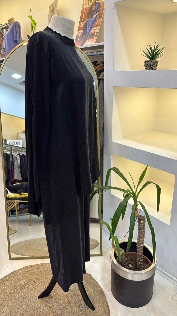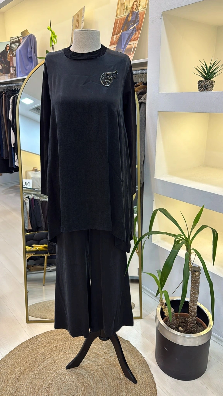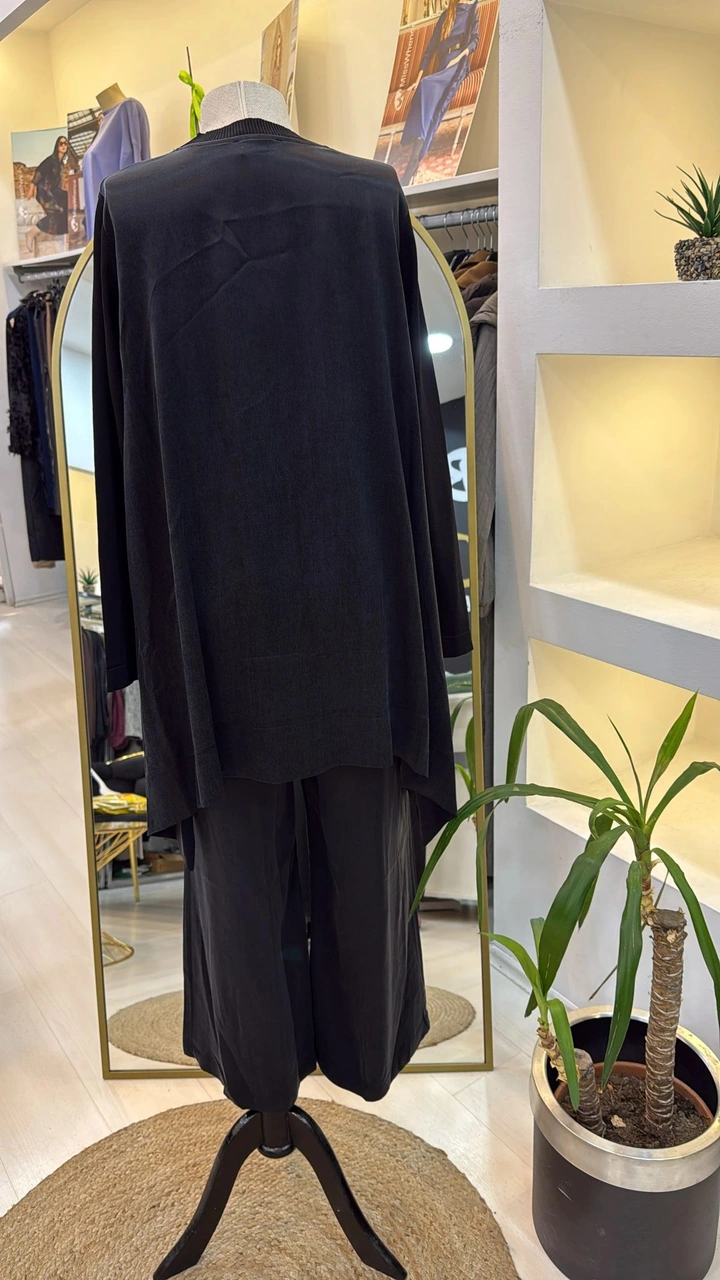 Tesettür İkili Takım Uzun Tunik Bol Paça Pantolon 4006-siyah Siyah
