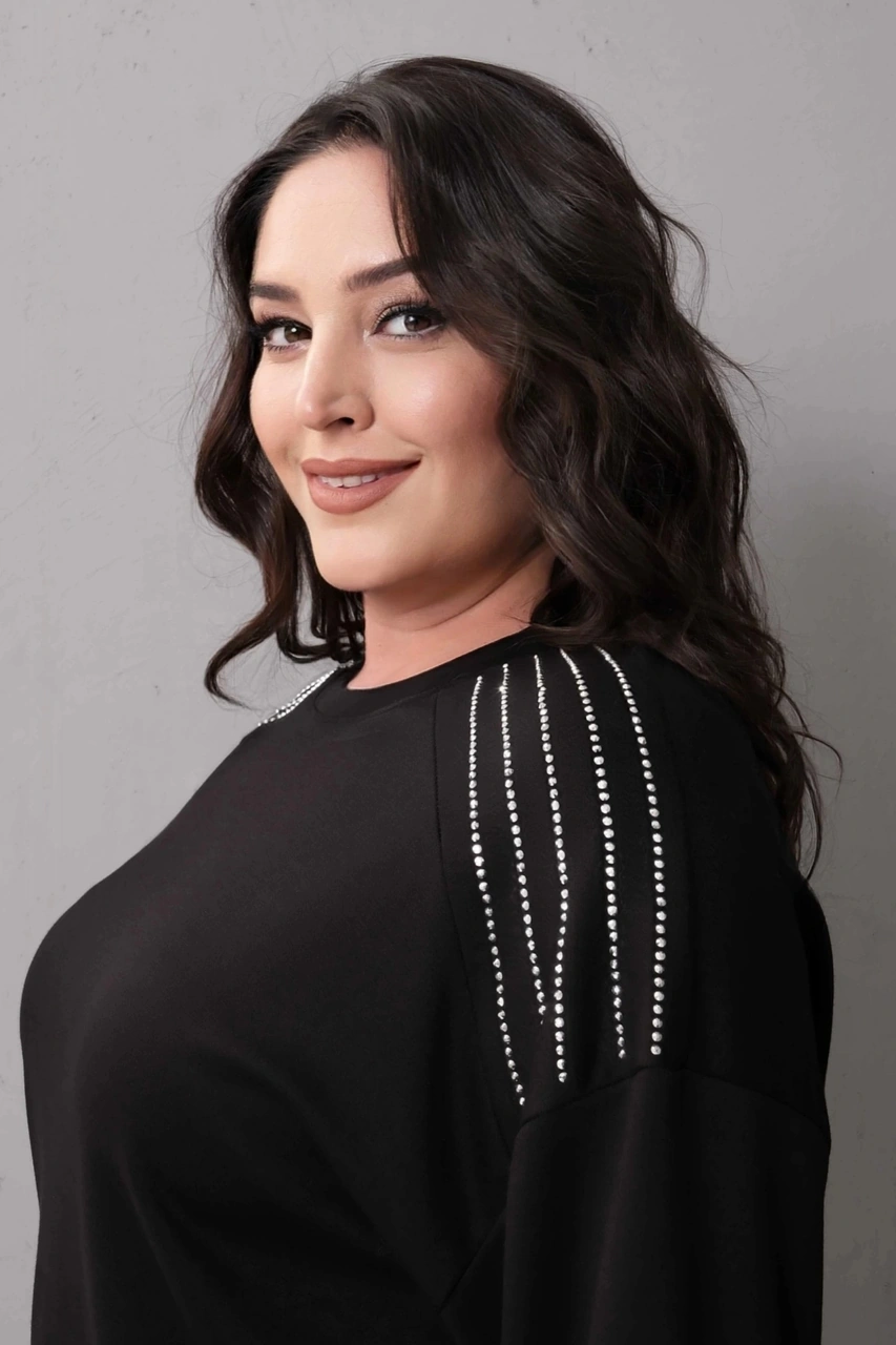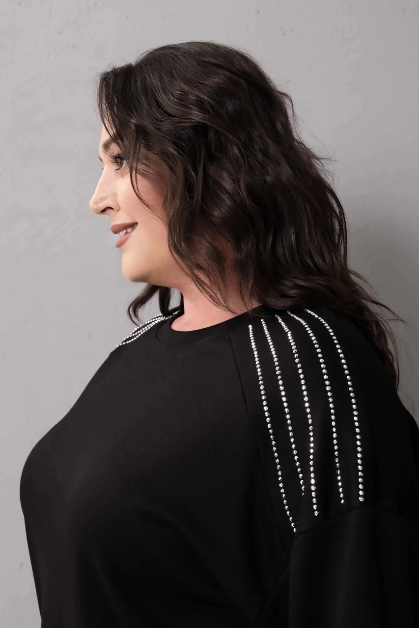 Omuzlar Taş Baskılı Sweatshirt Siyah
