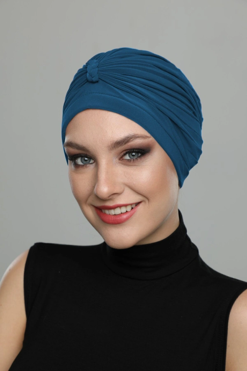 Örgülü Petrol Hazır Türban Tesettür Havuz Bonesi Petrol