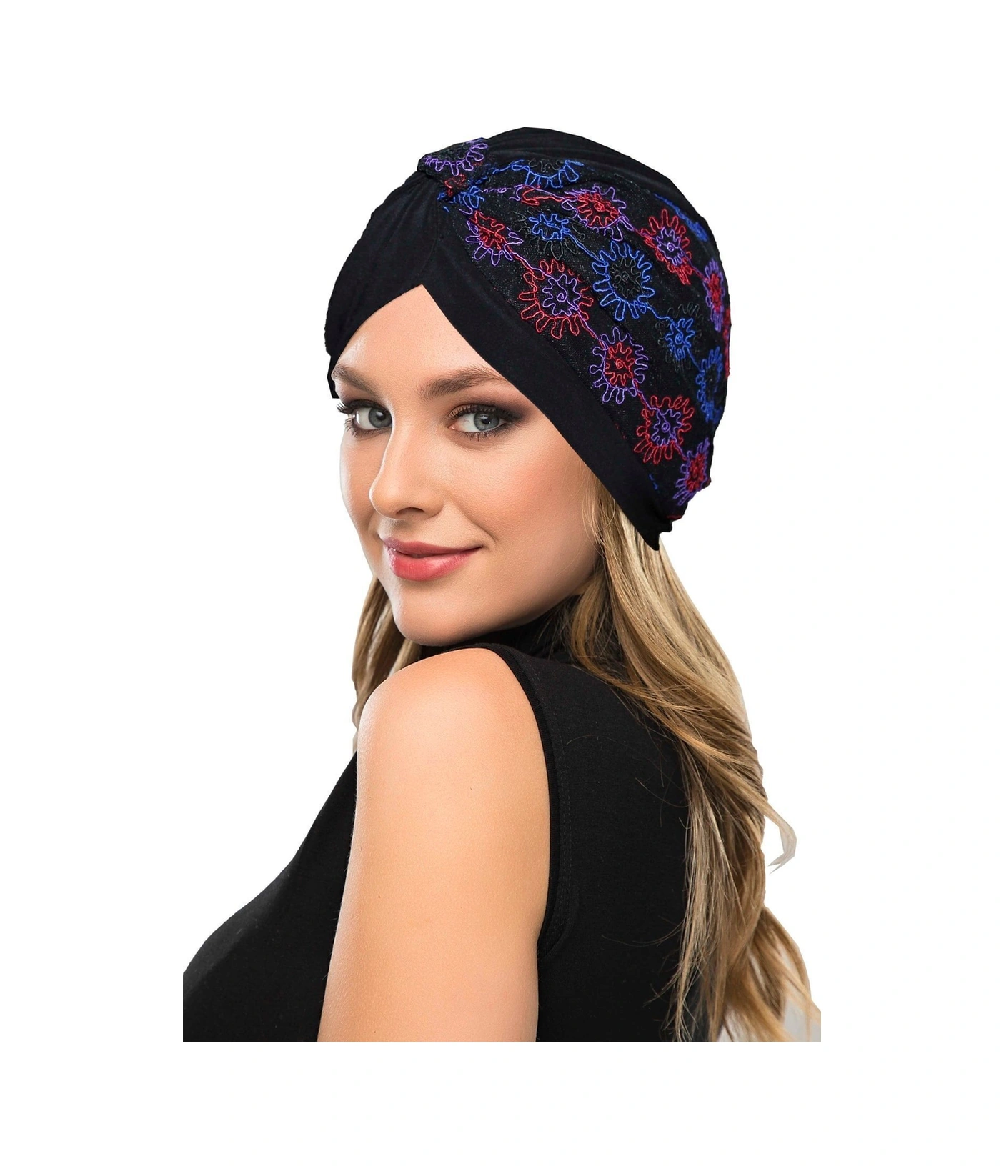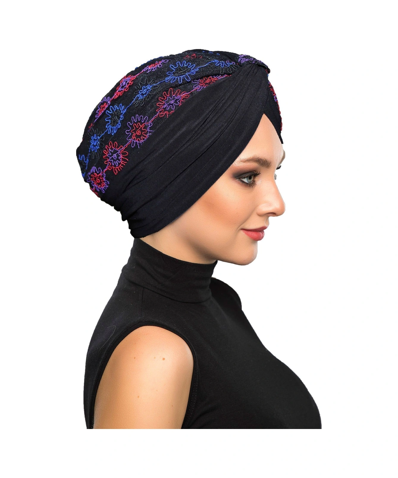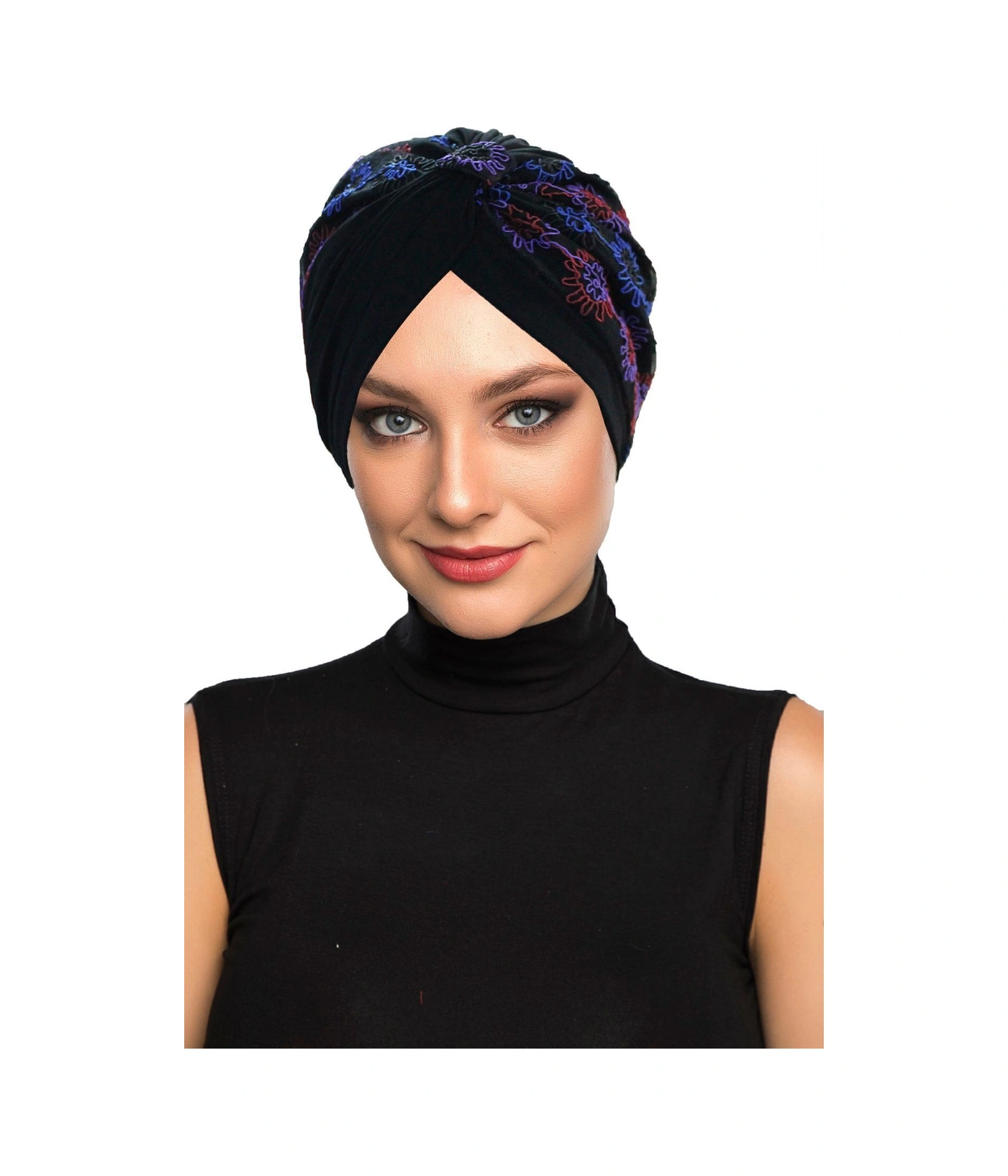 Otantik Nakış Motifli Astarlı Hazır Türban Tesettür Bone Siyah Motif 1
