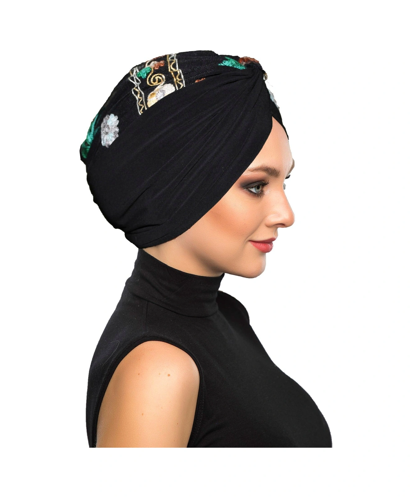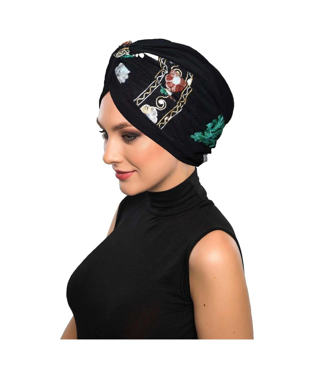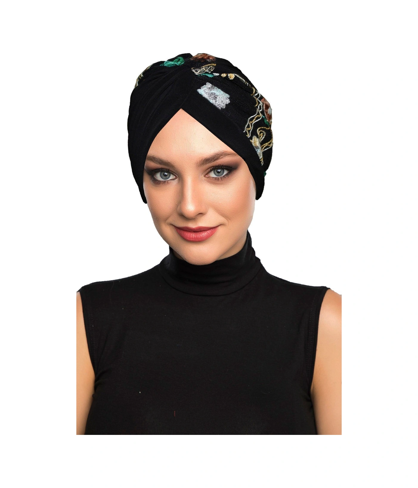 Otantik Nakış Motifli Astarlı Hazır Türban Tesettür Bone Siyah Motif 2