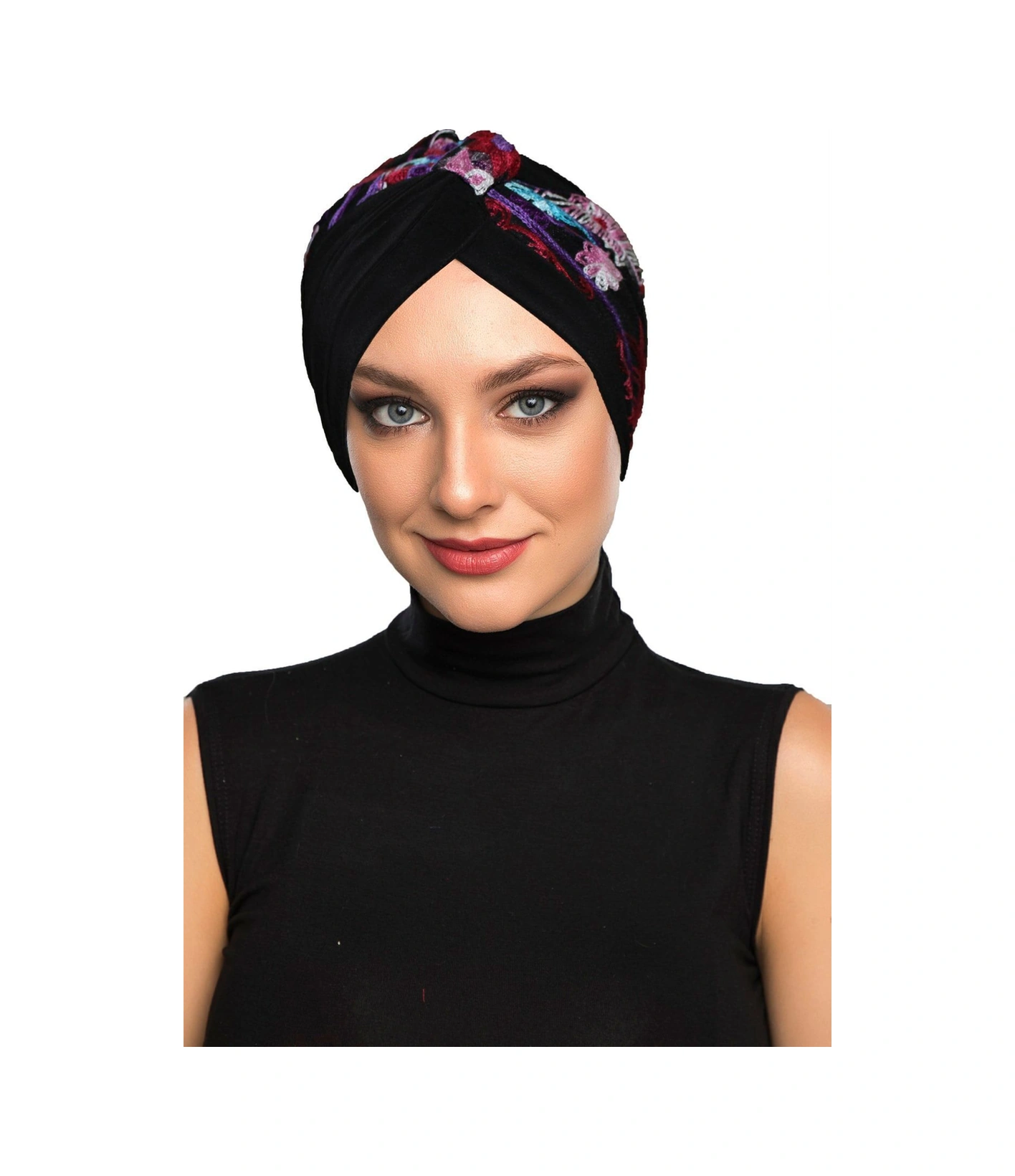 Otantik Nakış Motifli Astarlı Hazır Türban Tesettür Bone Siyah Motif 4