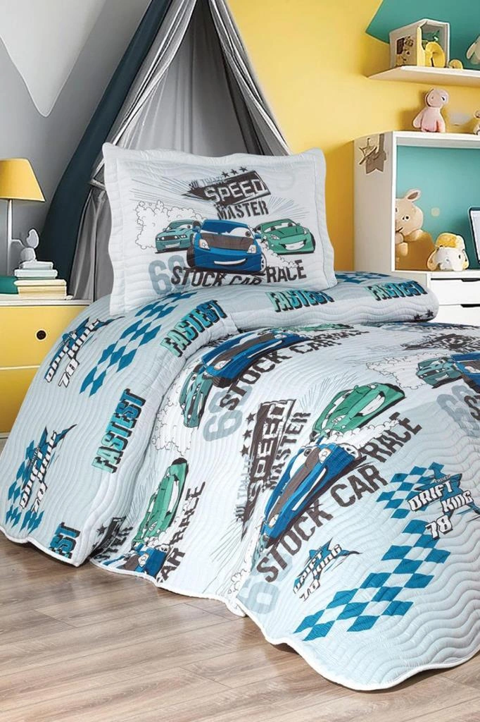 Oto Show Baskılı Kapitoneli Tek Kişilik Yatak Örtüsü Mavi Mavi