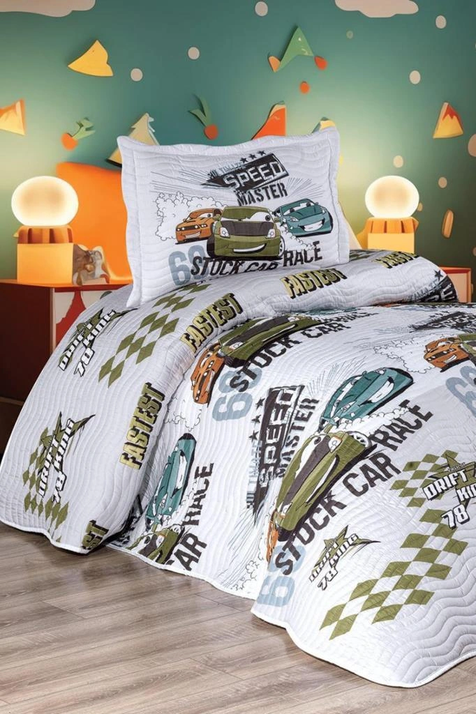 Oto Show Baskılı Kapitoneli Tek Kişilik Yatak Örtüsü Yeşil Yeşil