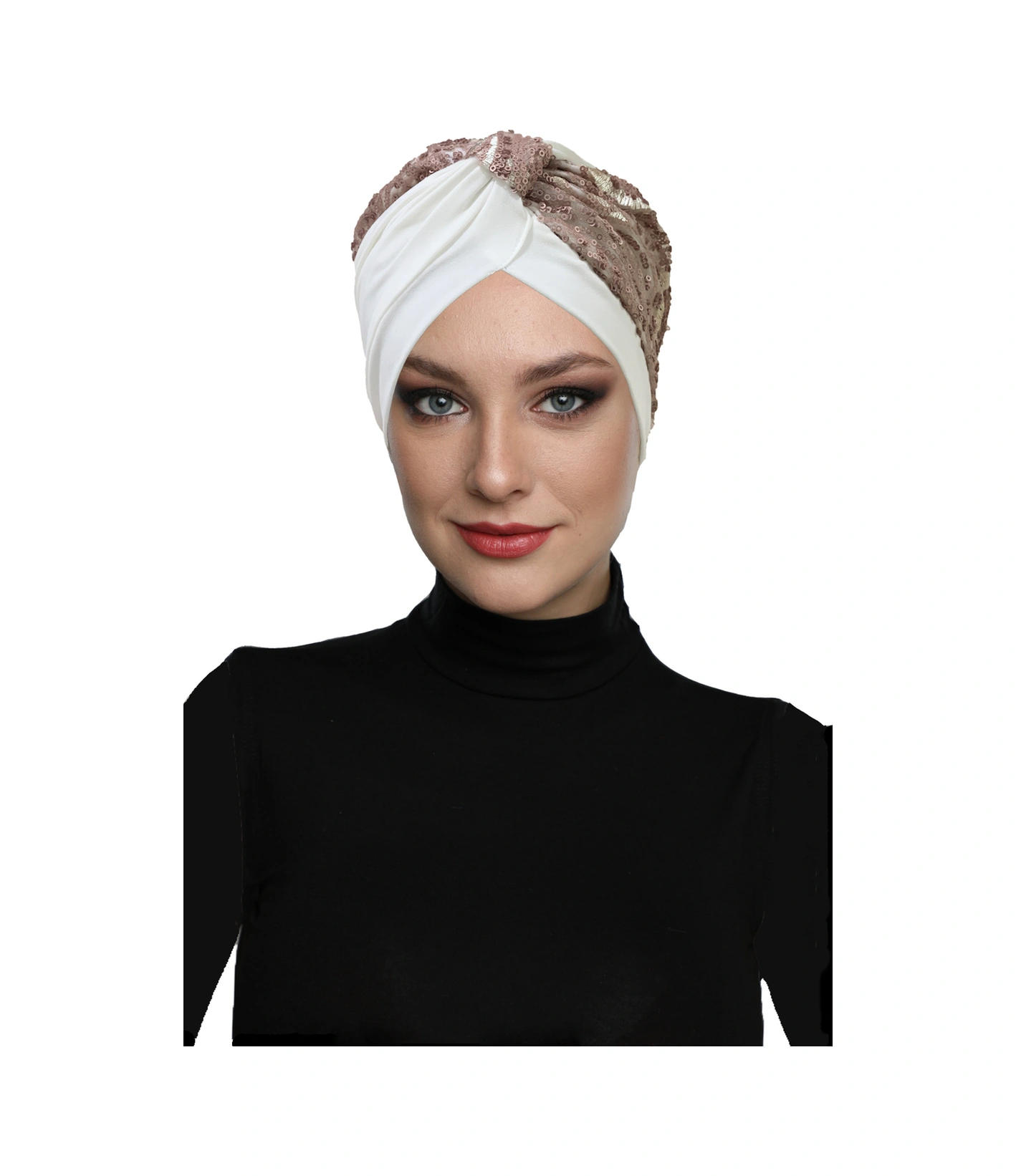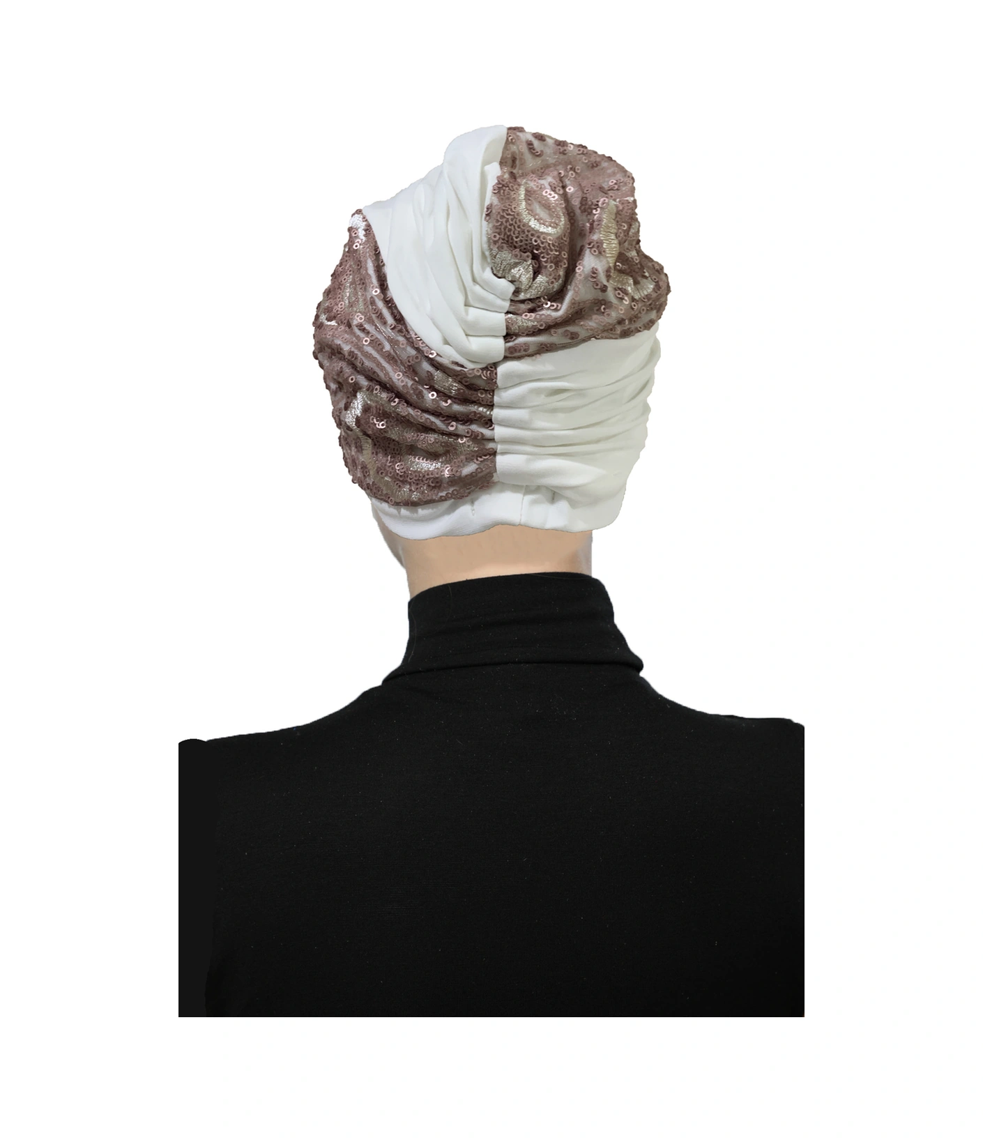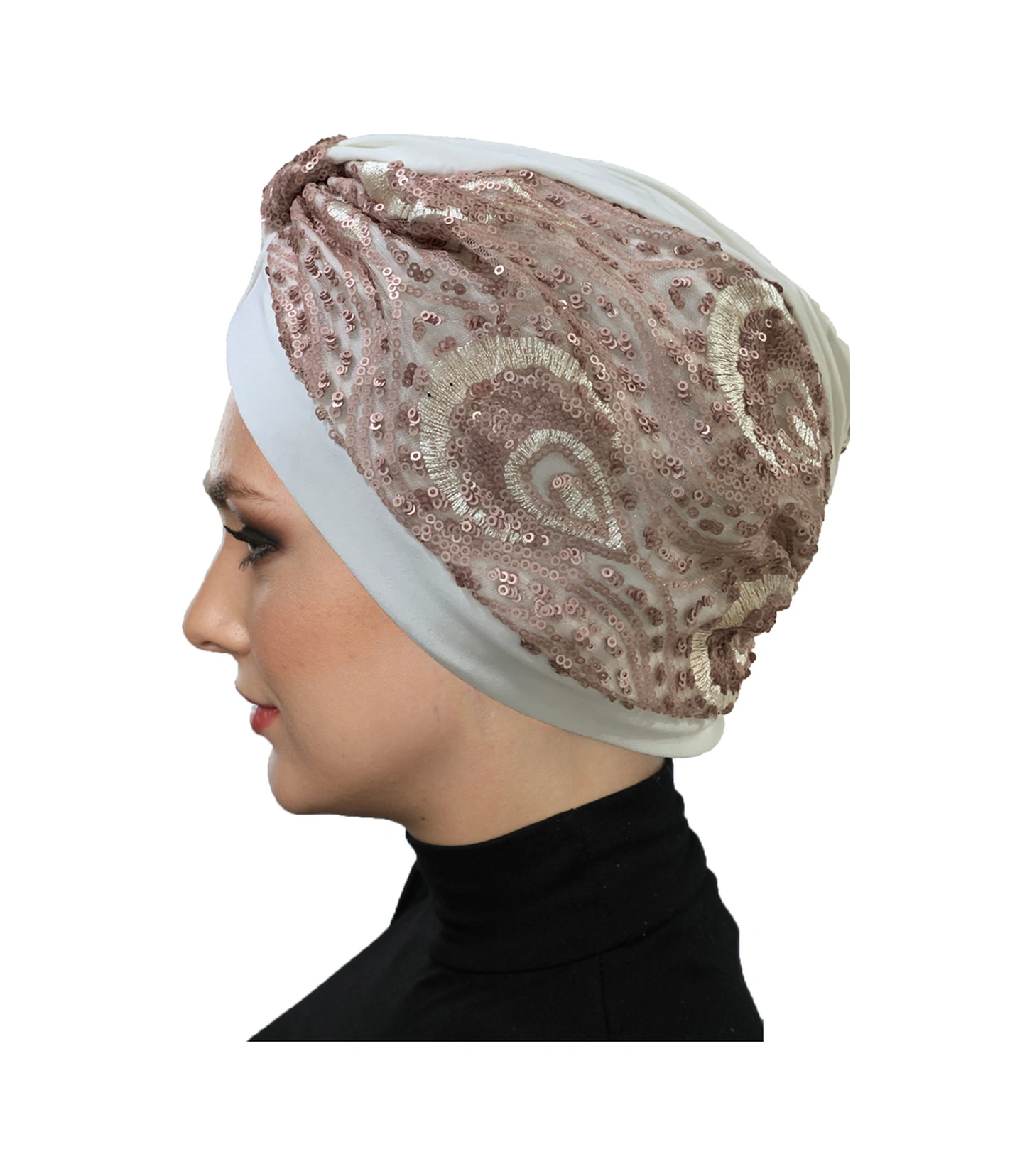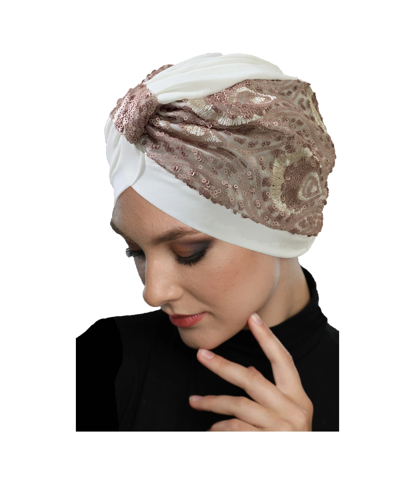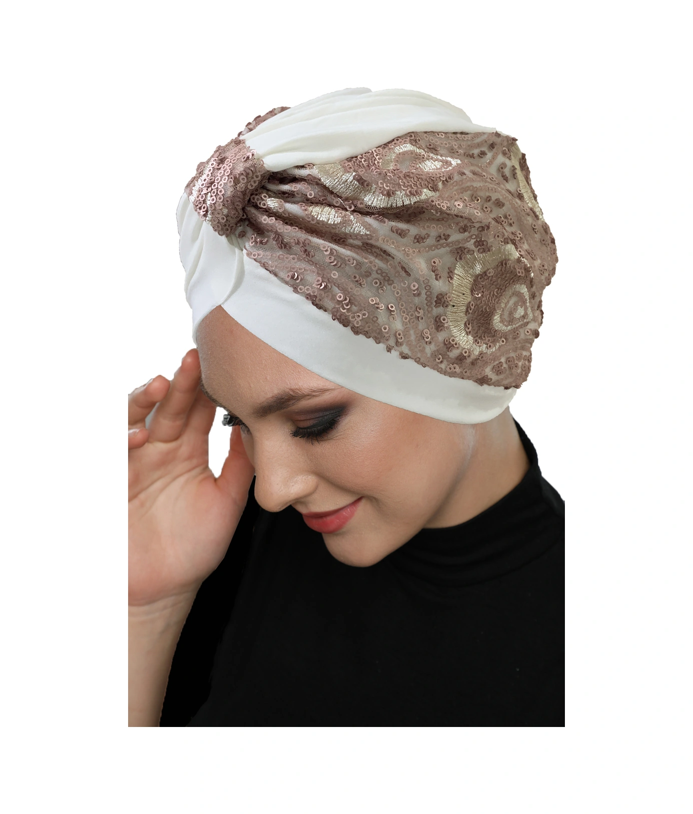 Özel Tasarım Ekru Üzeri Pudra Desenli Payetli Astarlı Hazır Türban Tesettür Abiye Bone Ekru2