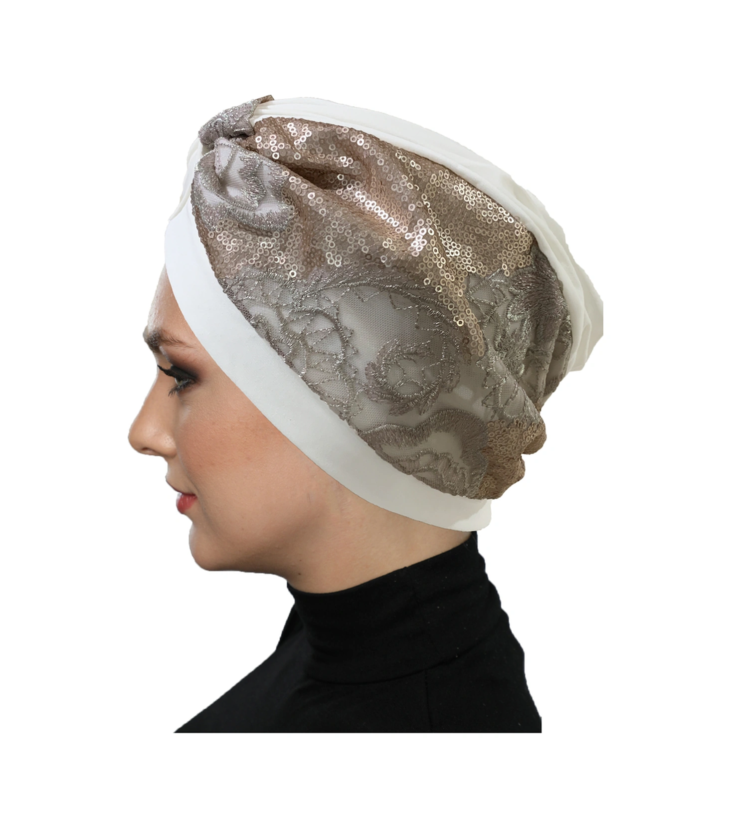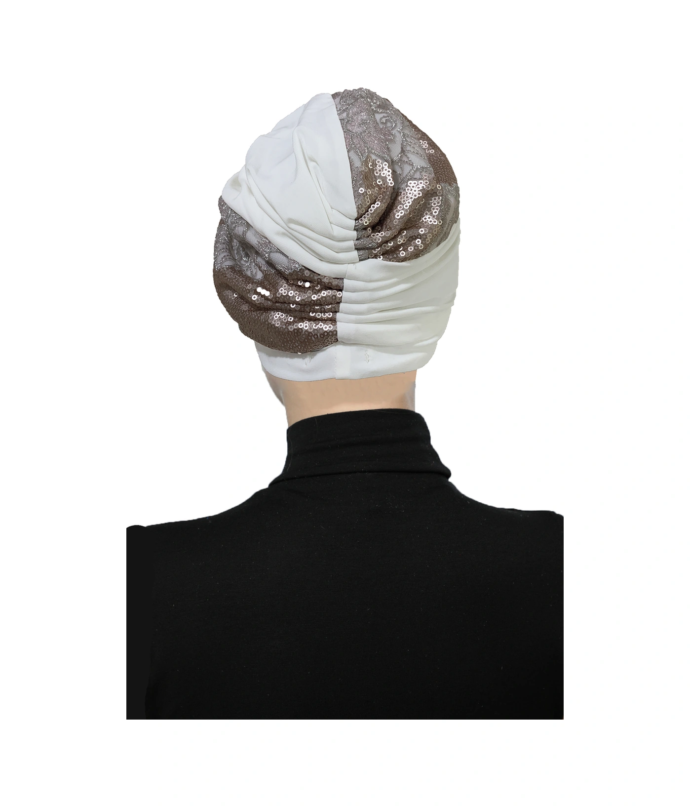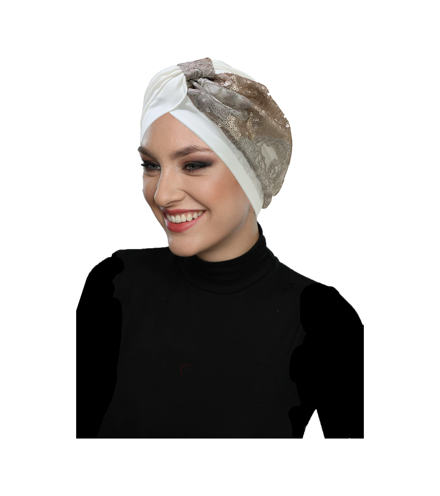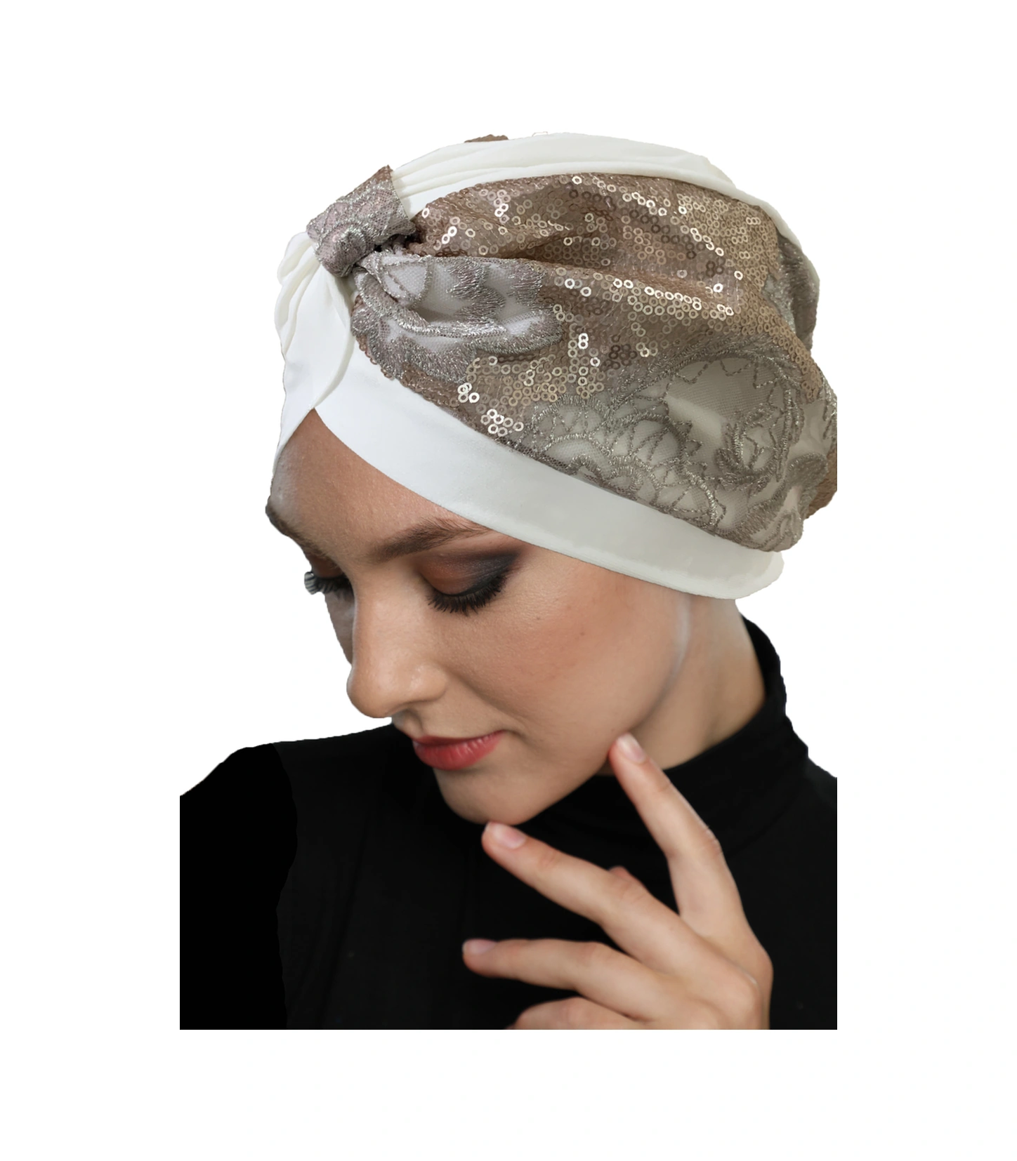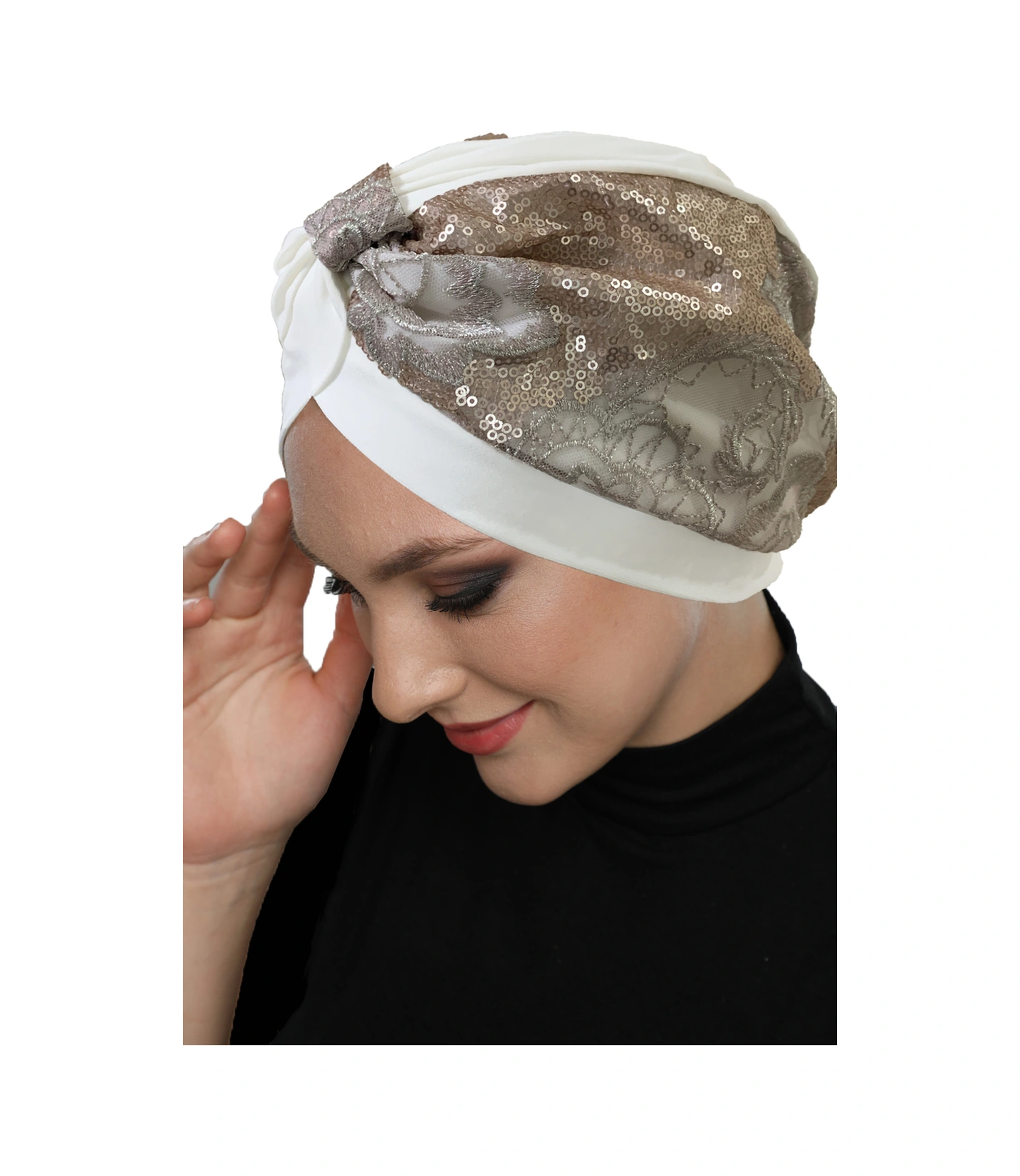Özel Tasarım Ekru Üzeri Pudra Payet Ve Aplikeli Astarlı Hazır Türban Tesettür Abiye Bone Ekru3