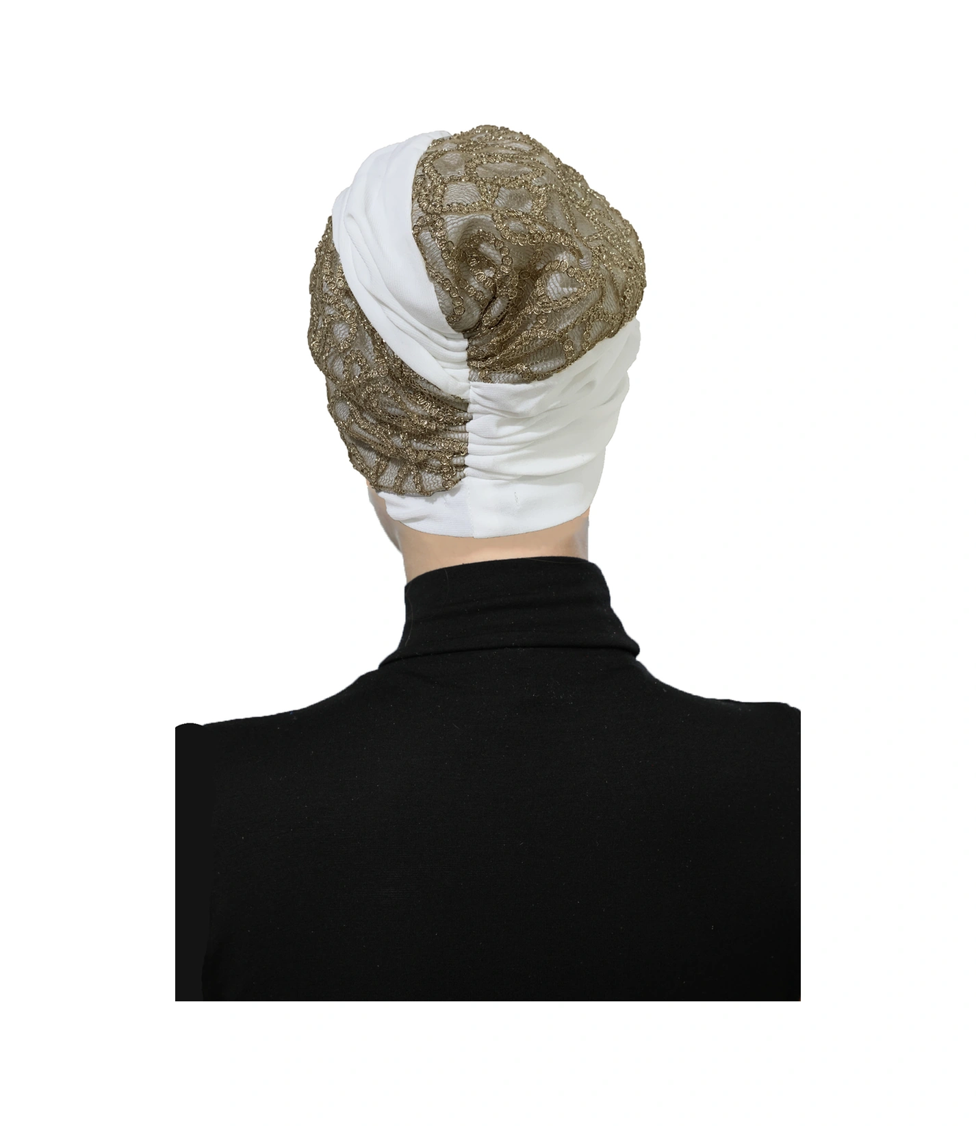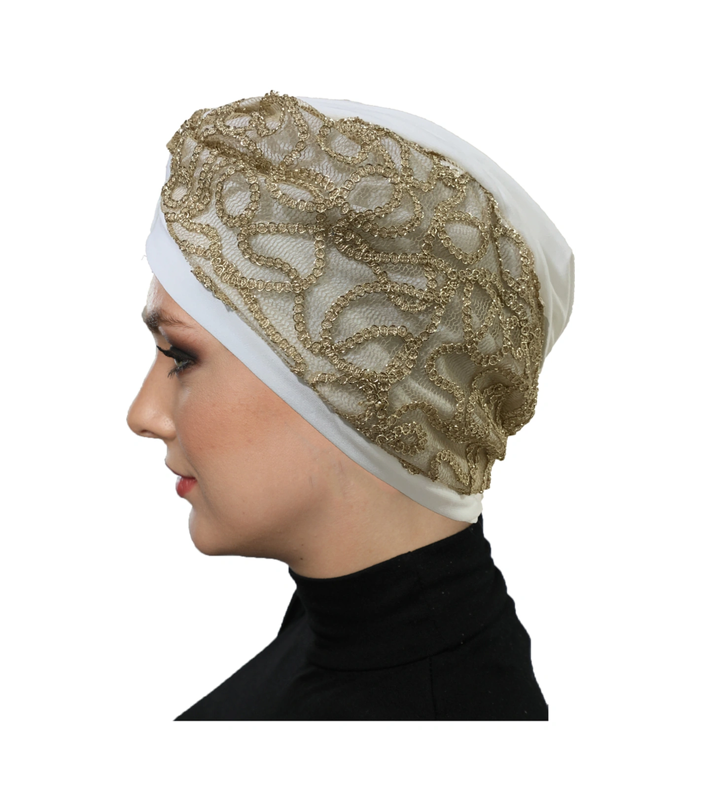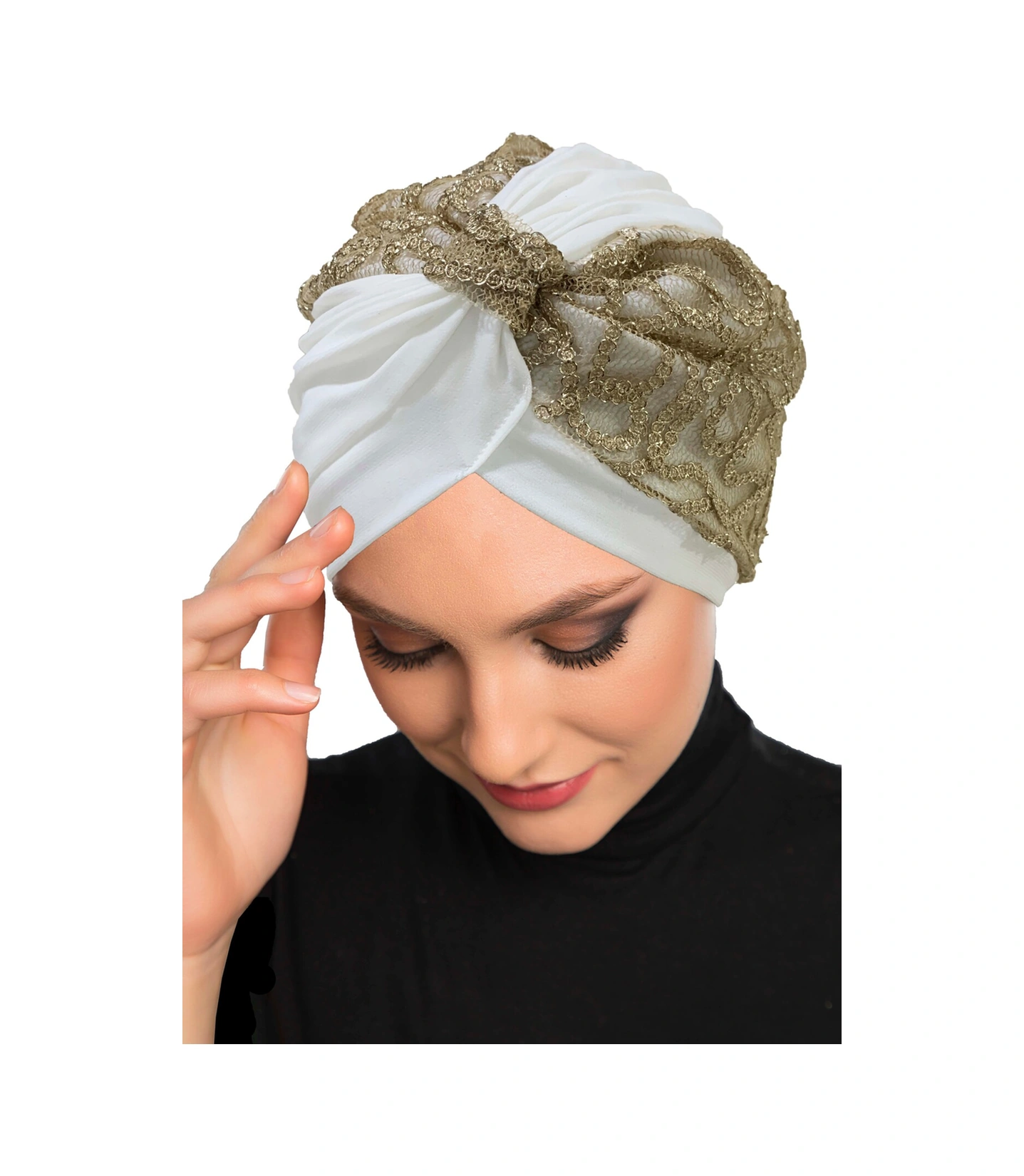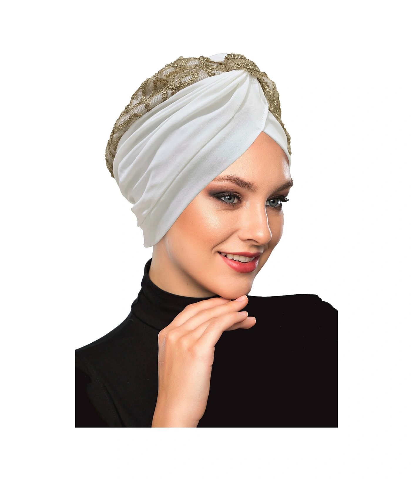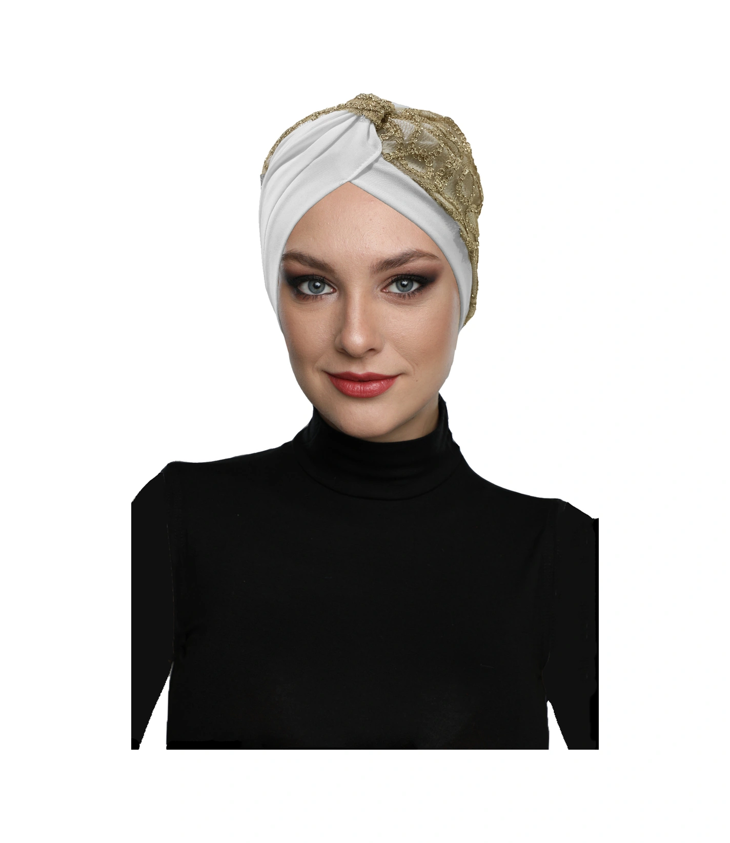 Özel Tasarım Ekru Üzeri Sırma Desenli Astarlı Hazır Türban Tesettür Abiye Bone Ekru4