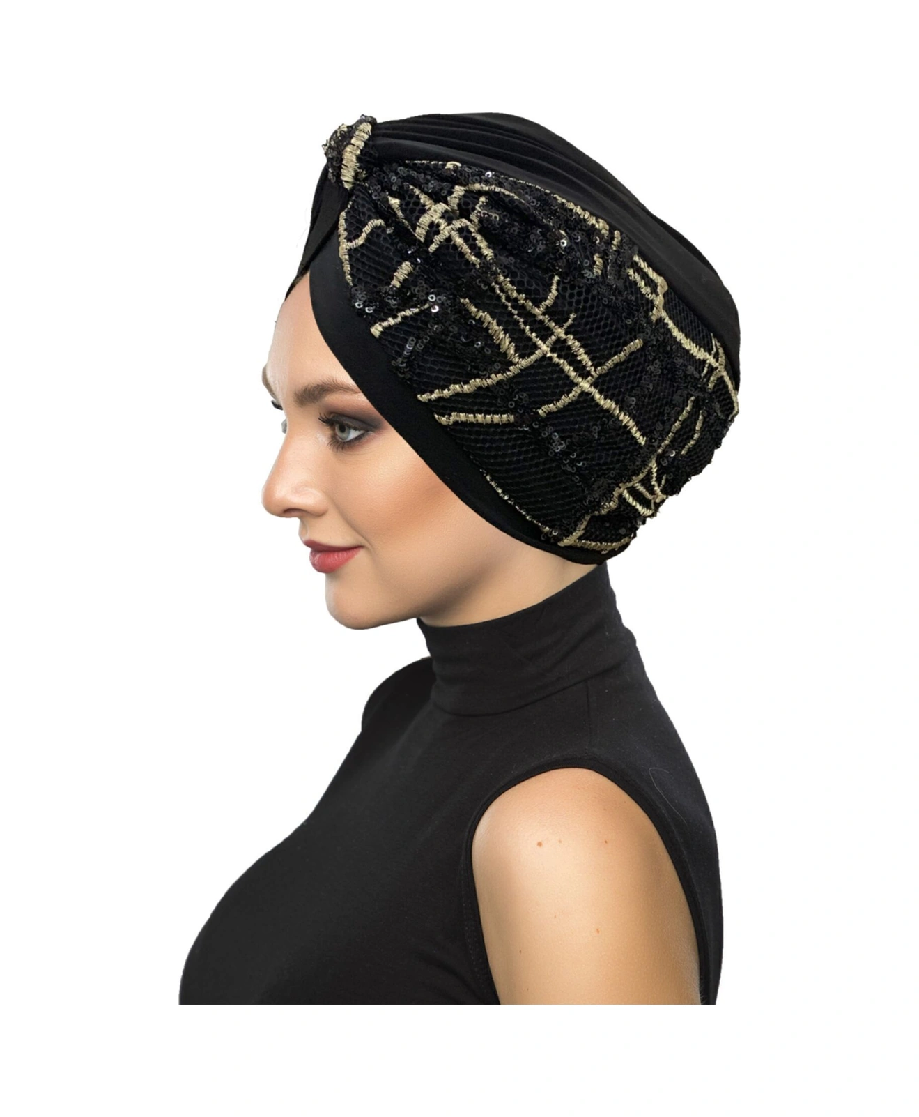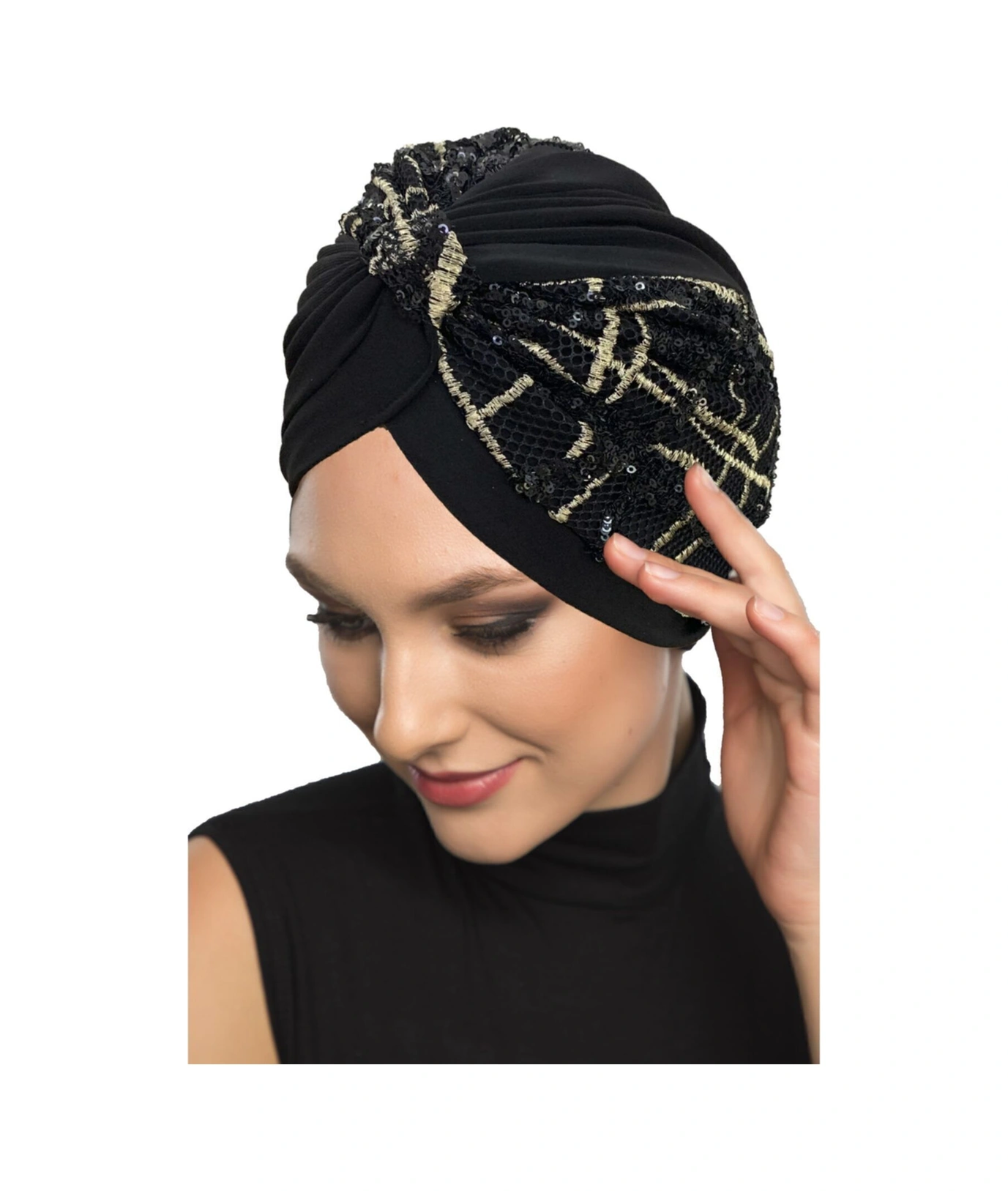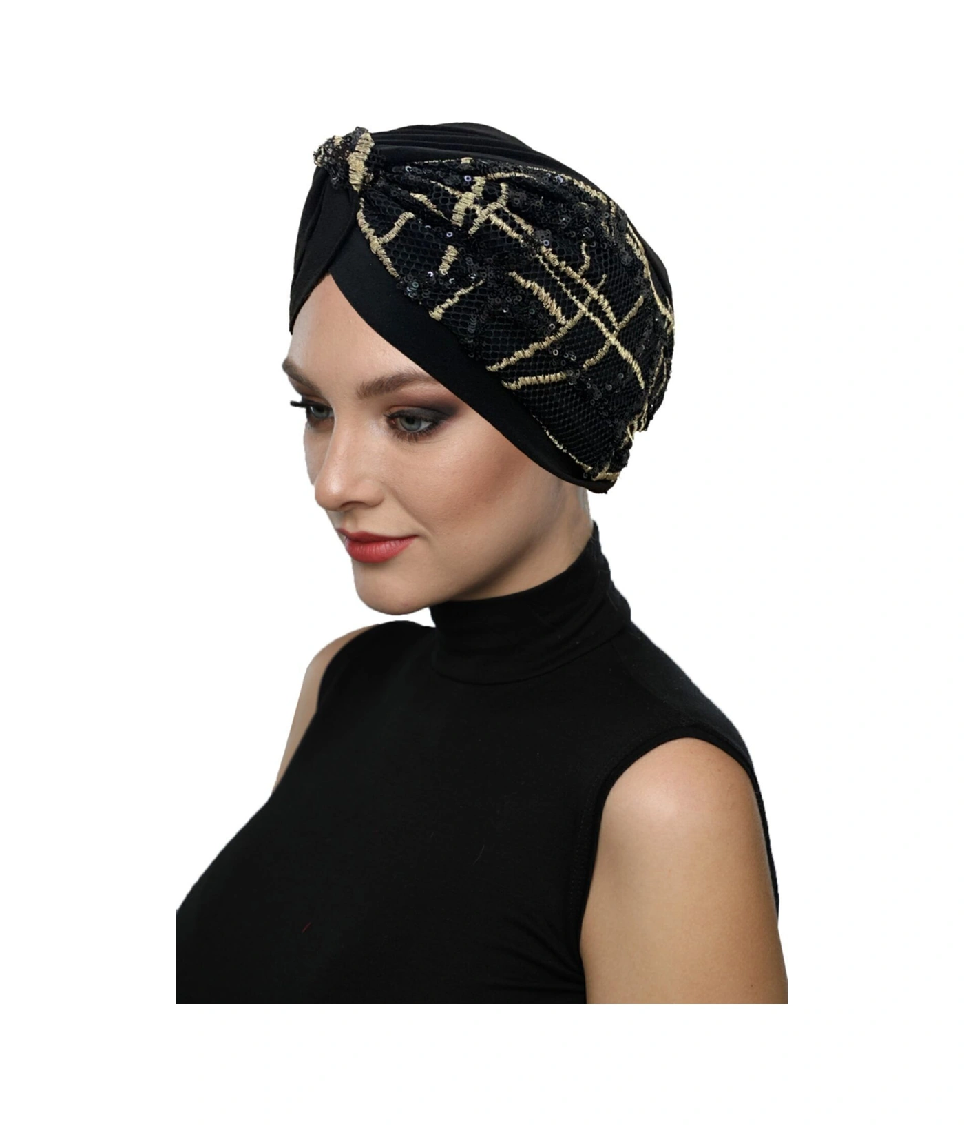 Özel Tasarım Siyah Bej-siyah Pullu Fileli Etnik Desenli Astarlı Hazır Türban Tesettür Abiye Bone Siyah16