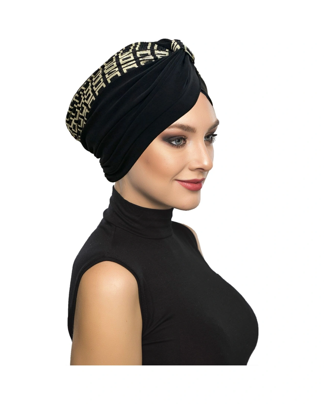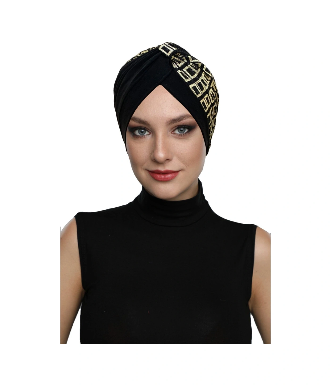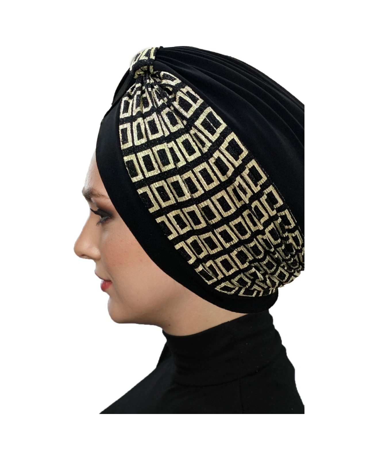 Özel Tasarım Siyah Üzeri Altın Ekose Desenli Astarlı Hazır Türban Tesettür Abiye Bone Siyah2