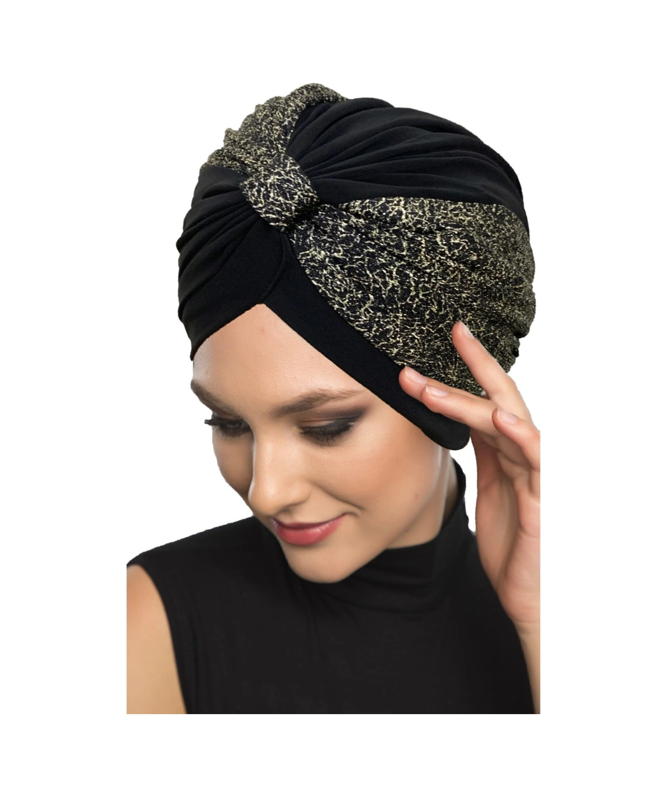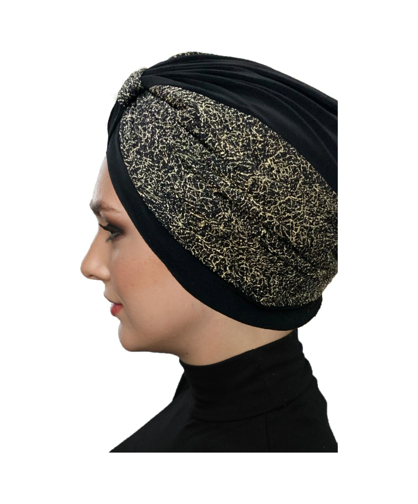 Özel Tasarım Siyah Üzeri Altın Kum Desenli Astarlı Hazır Türban Tesettür Abiye Bone Siyah15
