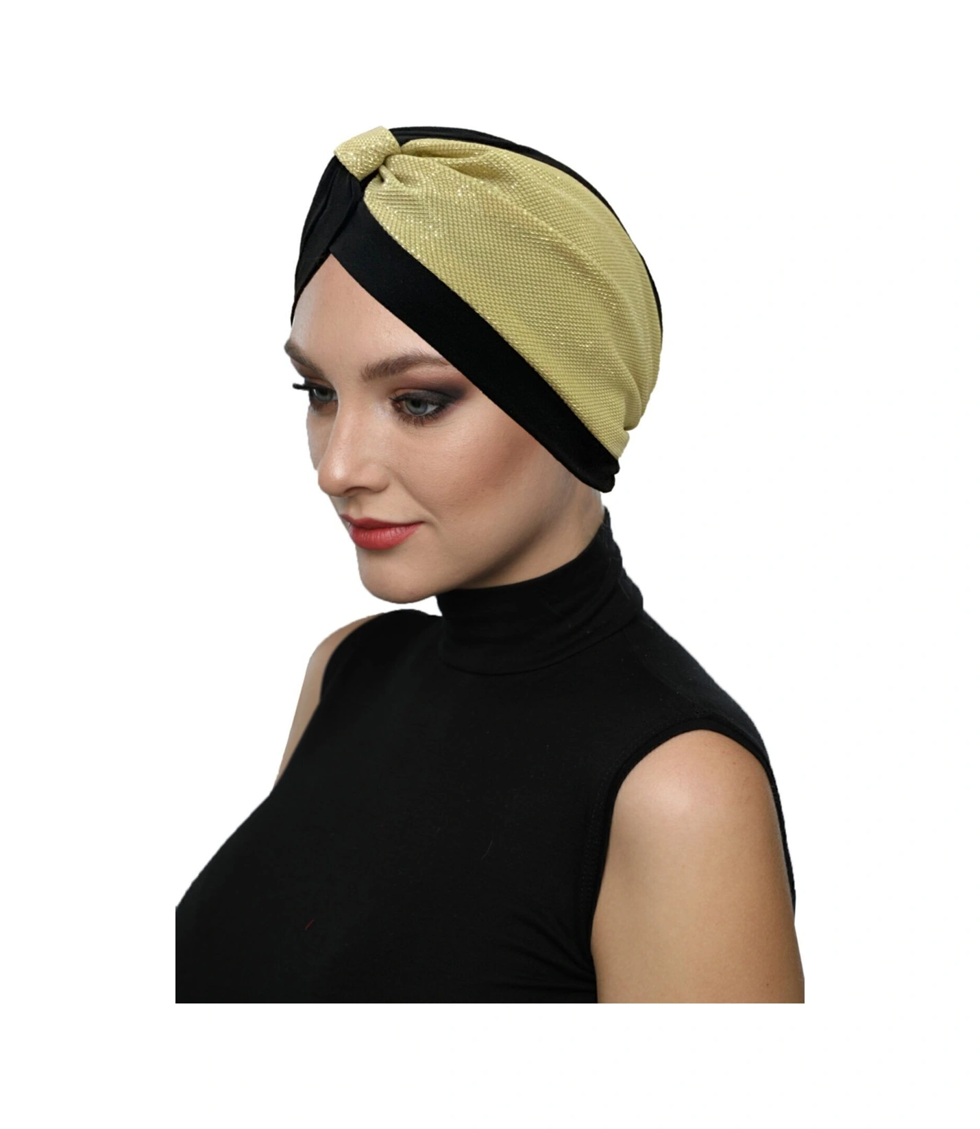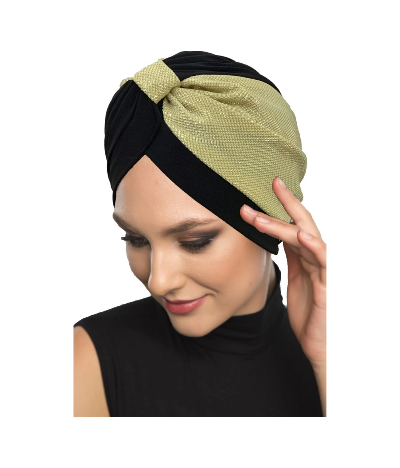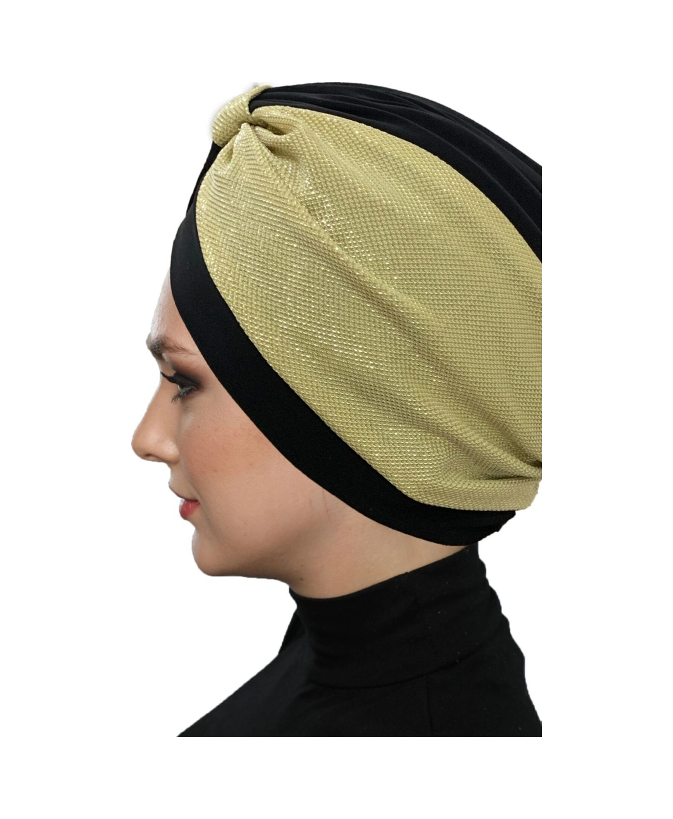 Özel Tasarım Siyah Üzeri Altın Pike Desenli Astarlı Hazır Türban Tesettür Abiye Bone Siyah3