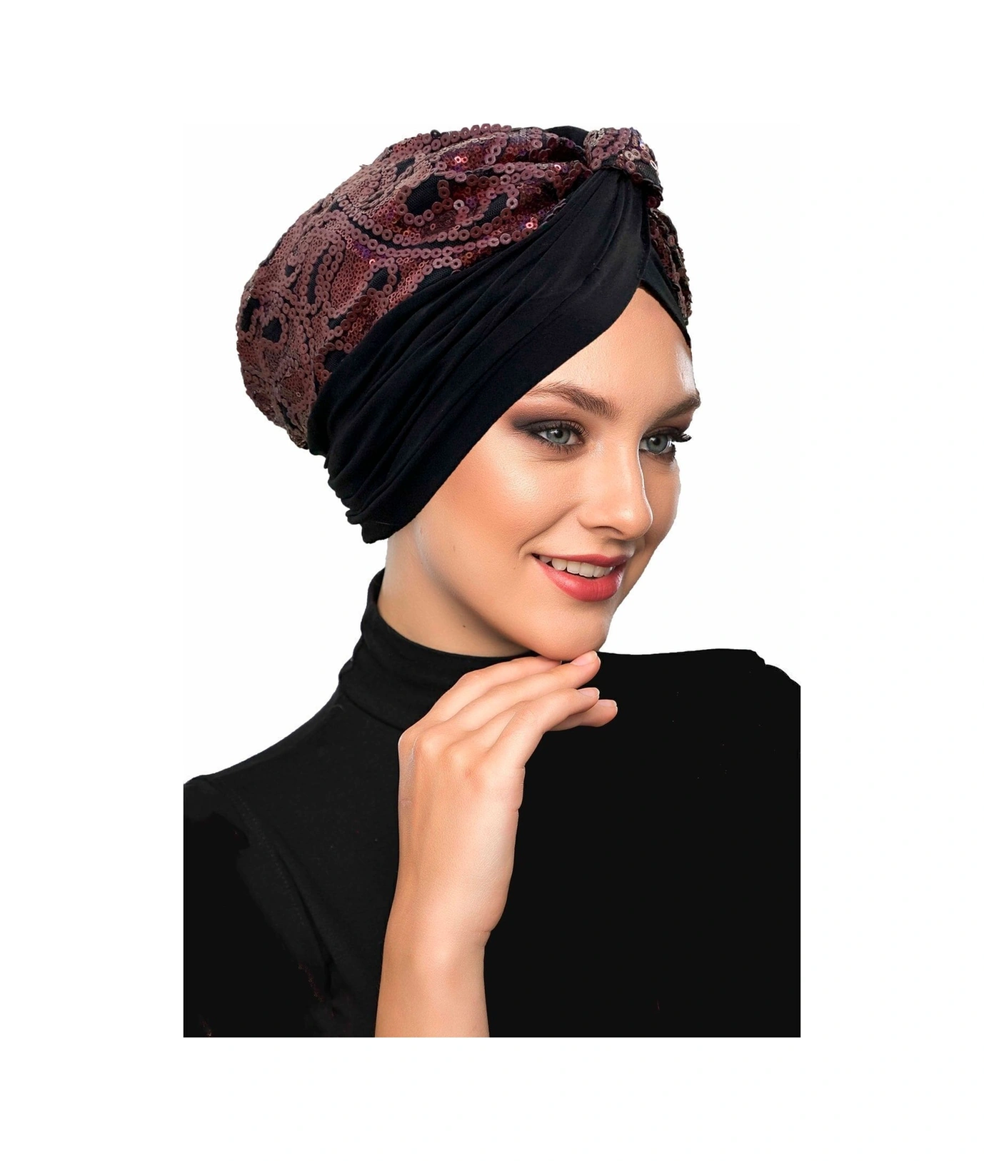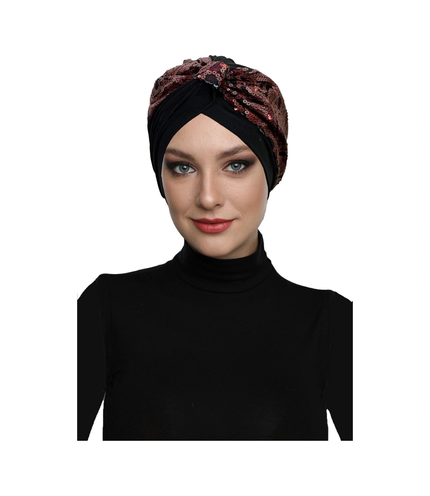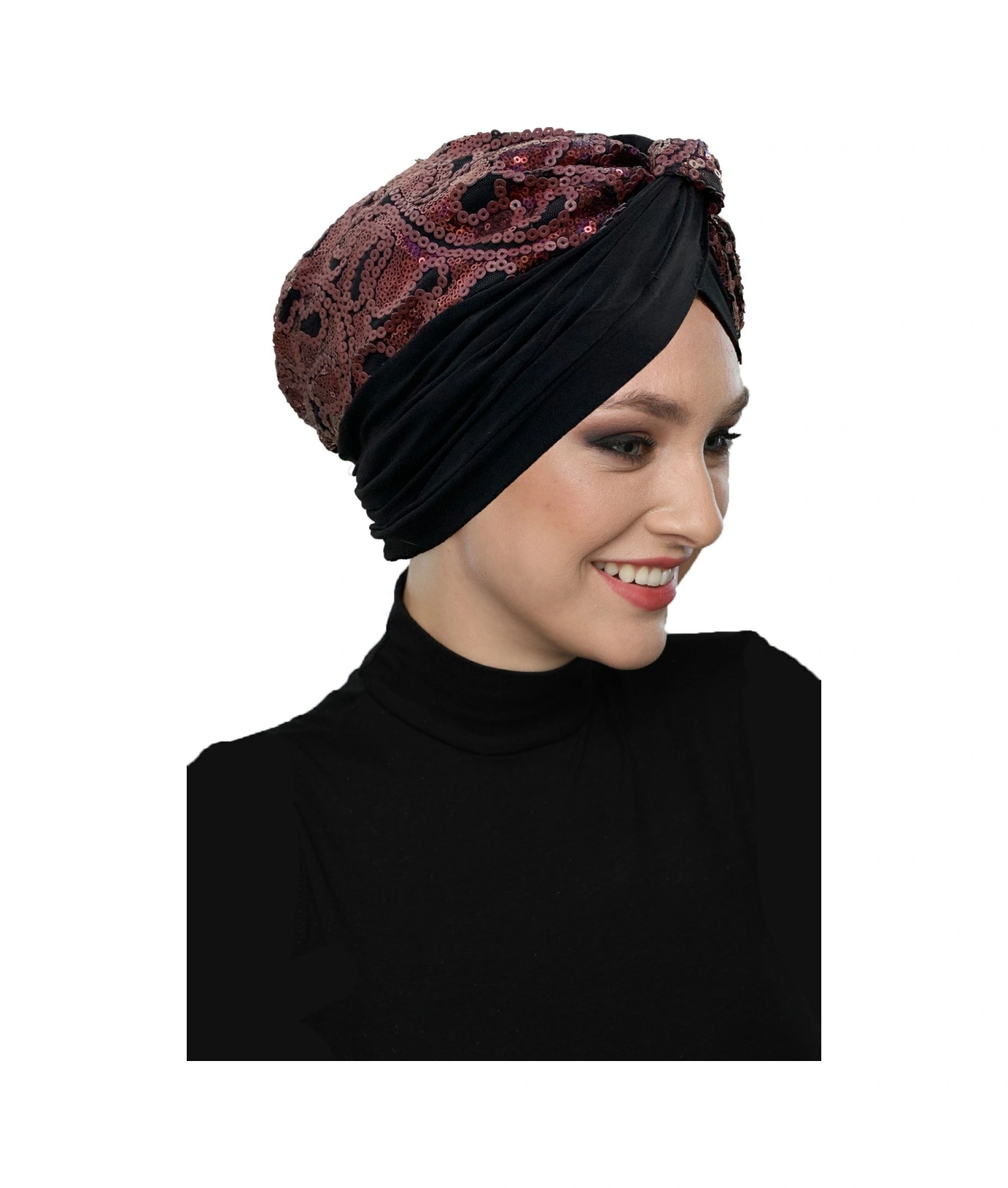 Özel Tasarım Siyah Üzeri Bordo Desenli Payetli Astarlı Hazır Türban Tesettür Abiye Bone Siyah27