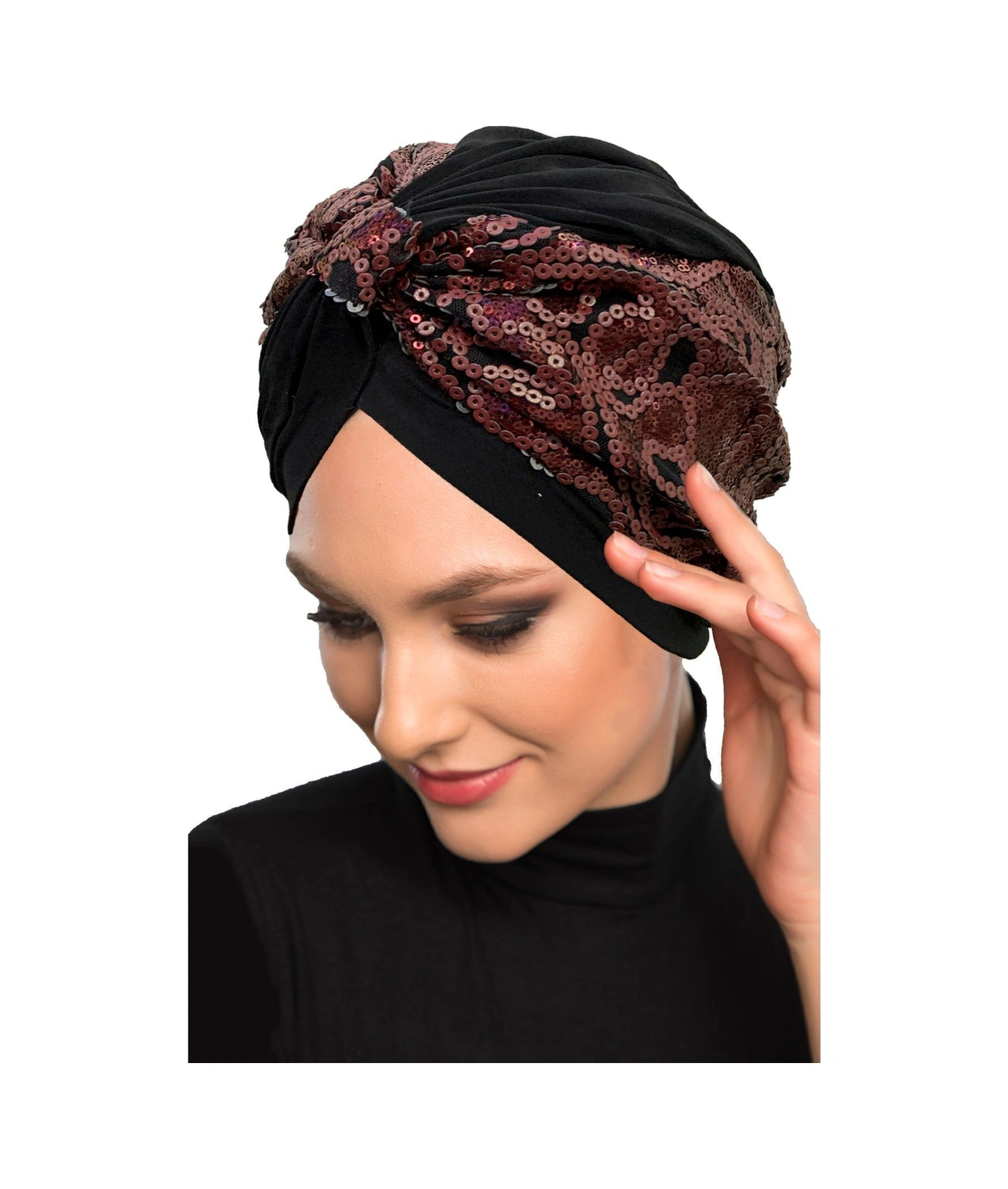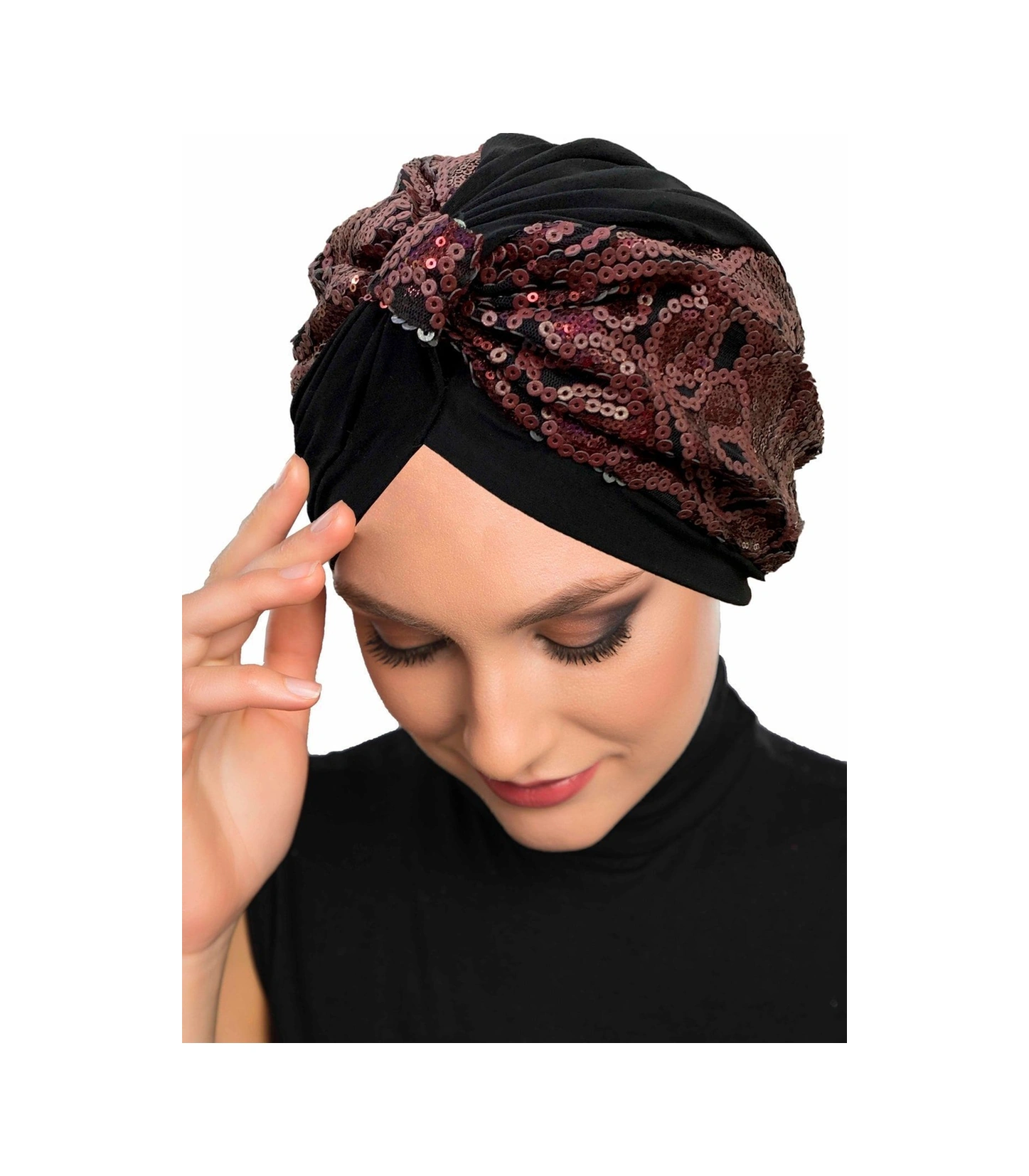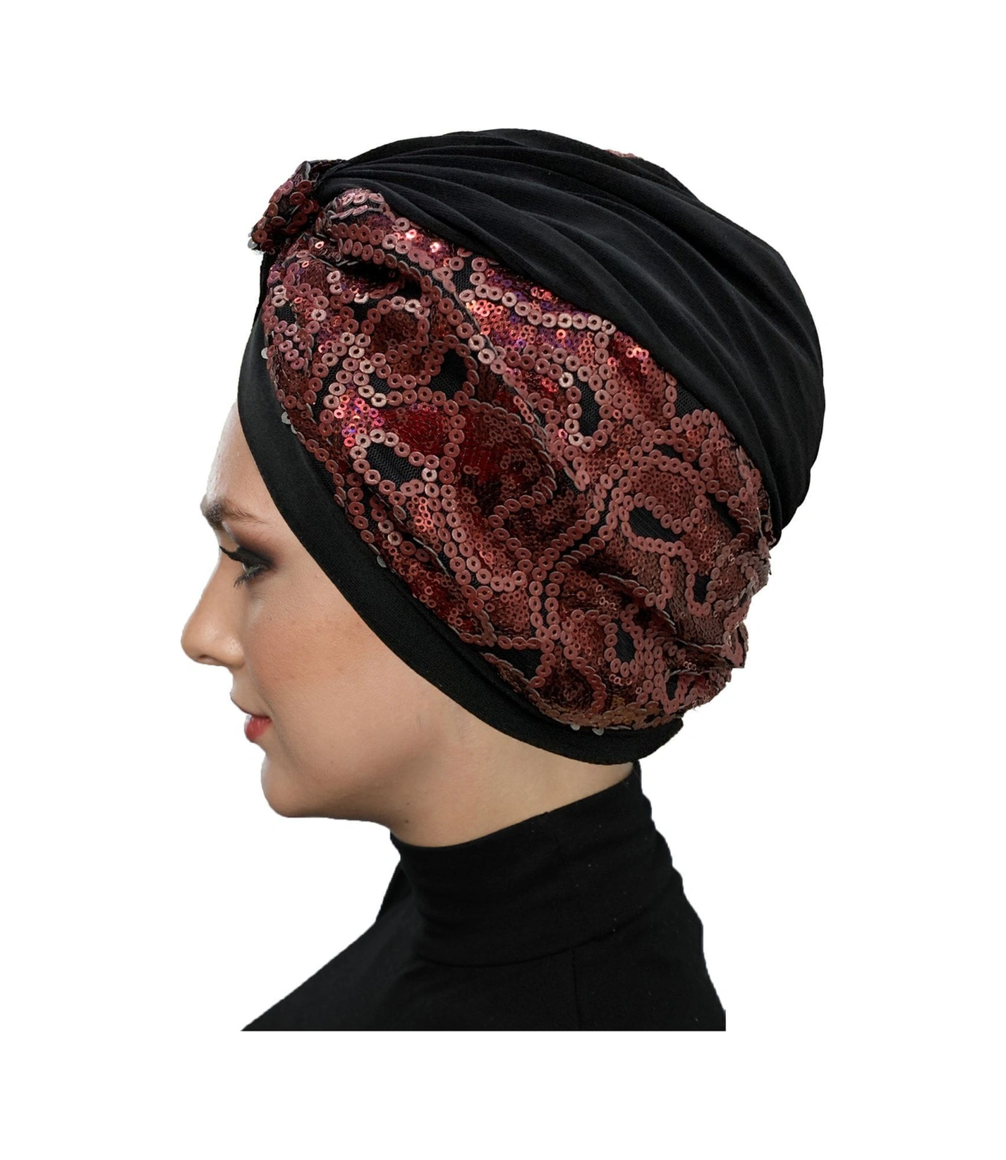 Özel Tasarım Siyah Üzeri Bordo Desenli Payetli Astarlı Hazır Türban Tesettür Abiye Bone Siyah27