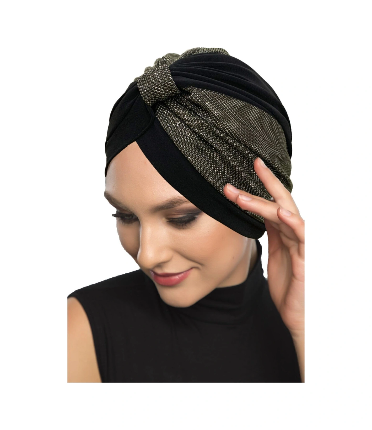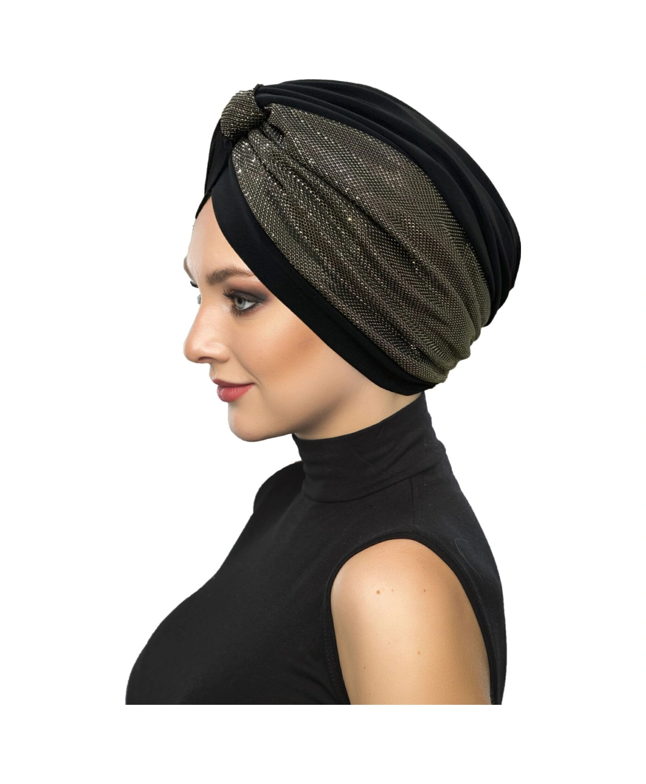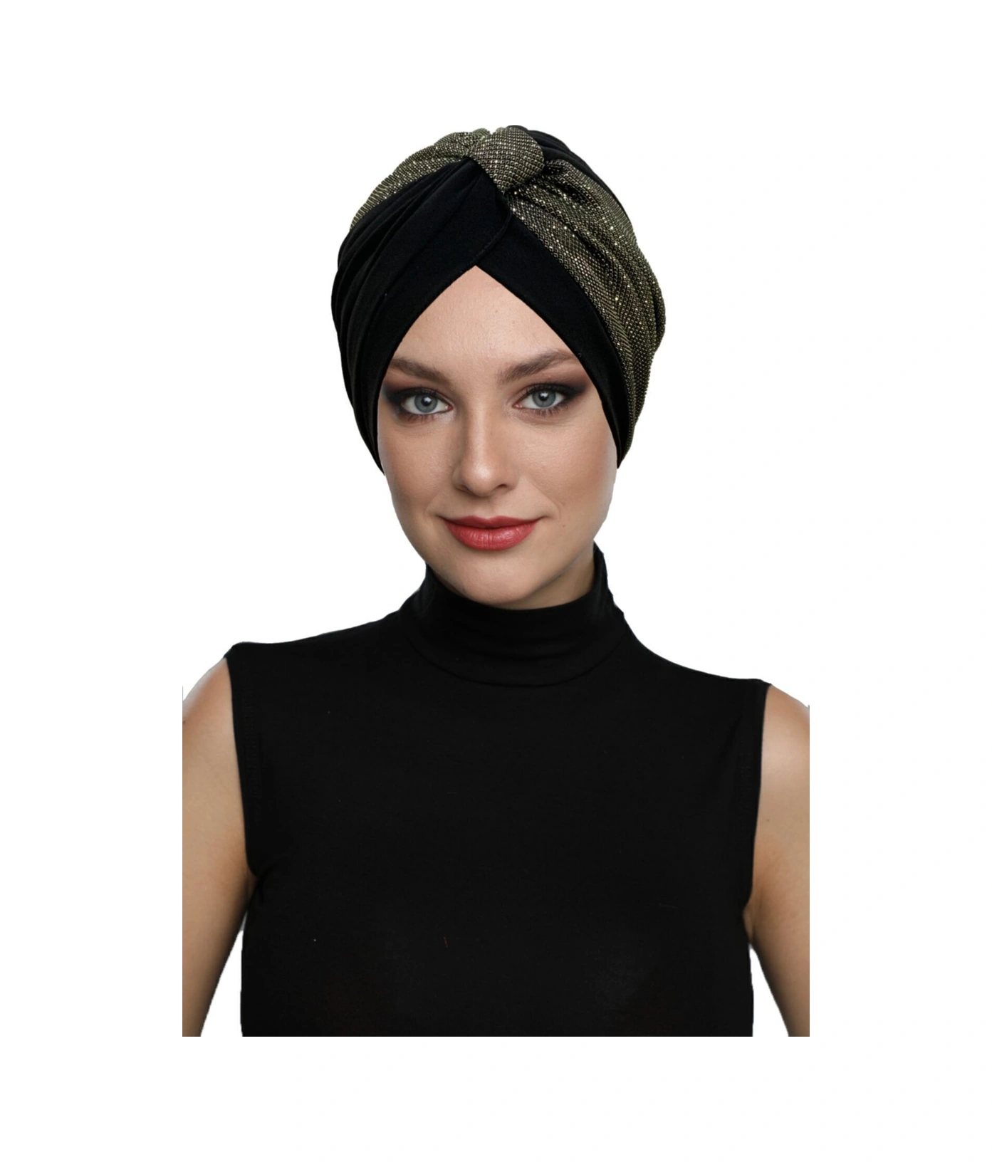 Özel Tasarım Siyah Üzeri Siyah-altın Pike Desenli Astarlı Hazır Türban Tesettür Abiye Bone Siyah18