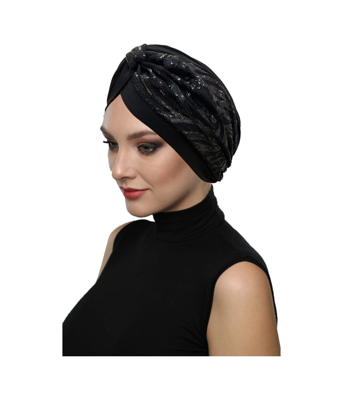 Özel Tasarım Siyah Üzeri Siyah Desenli Payetli Astarlı Hazır Türban Tesettür Abiye Bone Siyah6