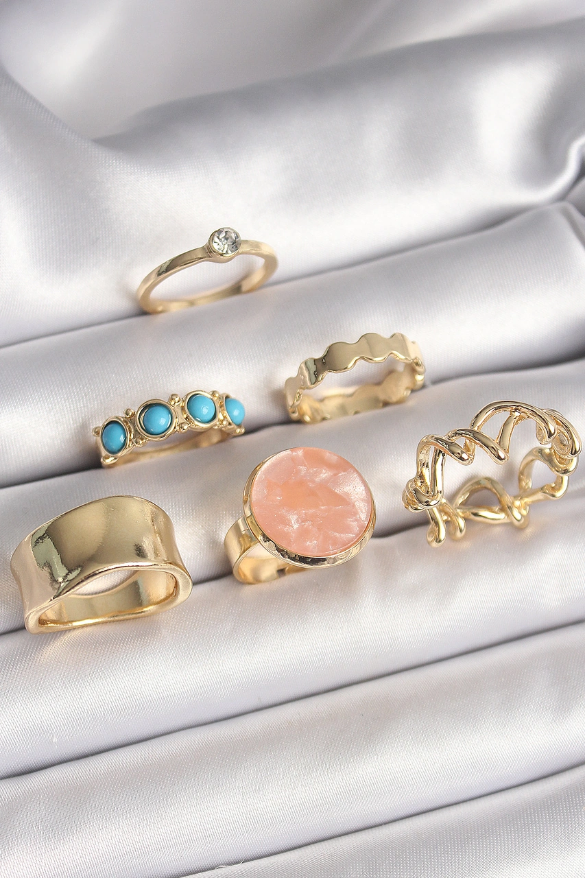 Pirinç Gold Renk Daire Pembe Mineli Zirkon Taş Detaylı 6'lı Kadı Renkli
