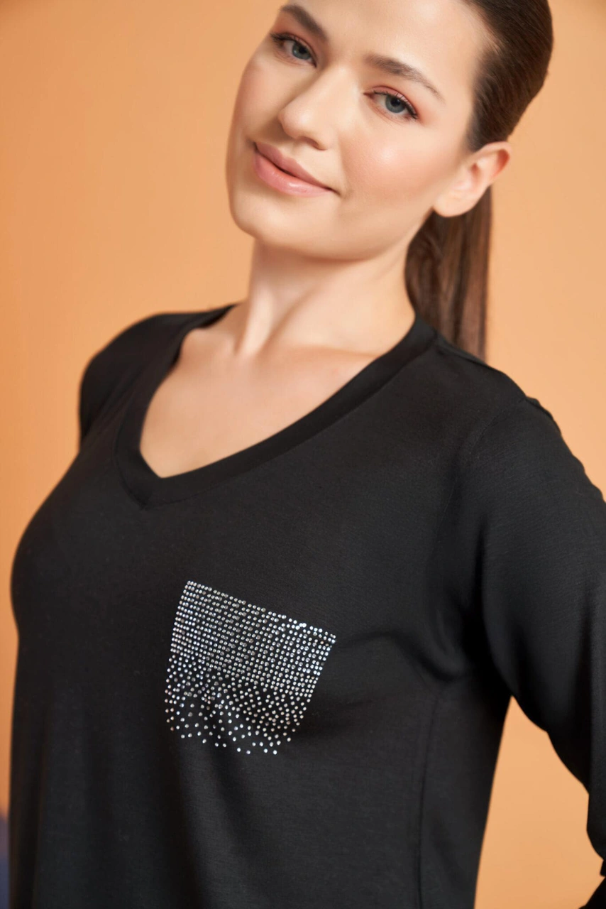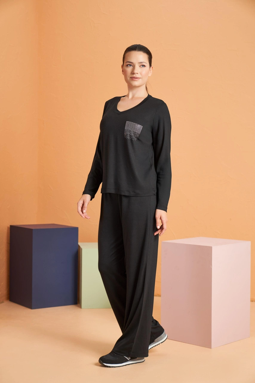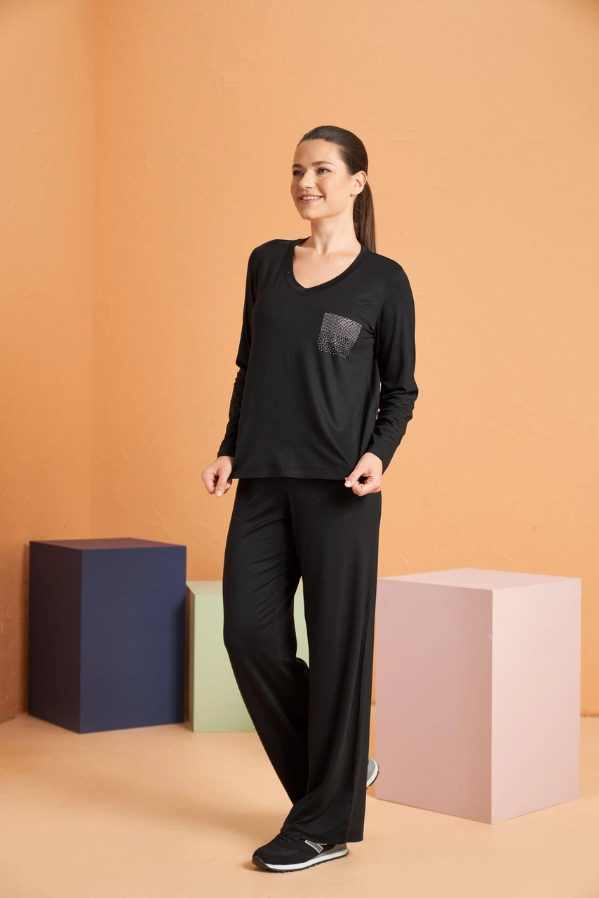 Pjs Kadın V Yaka Likralı Viskon Kumaş Uzun Kollu Eşofman Takım Siyah