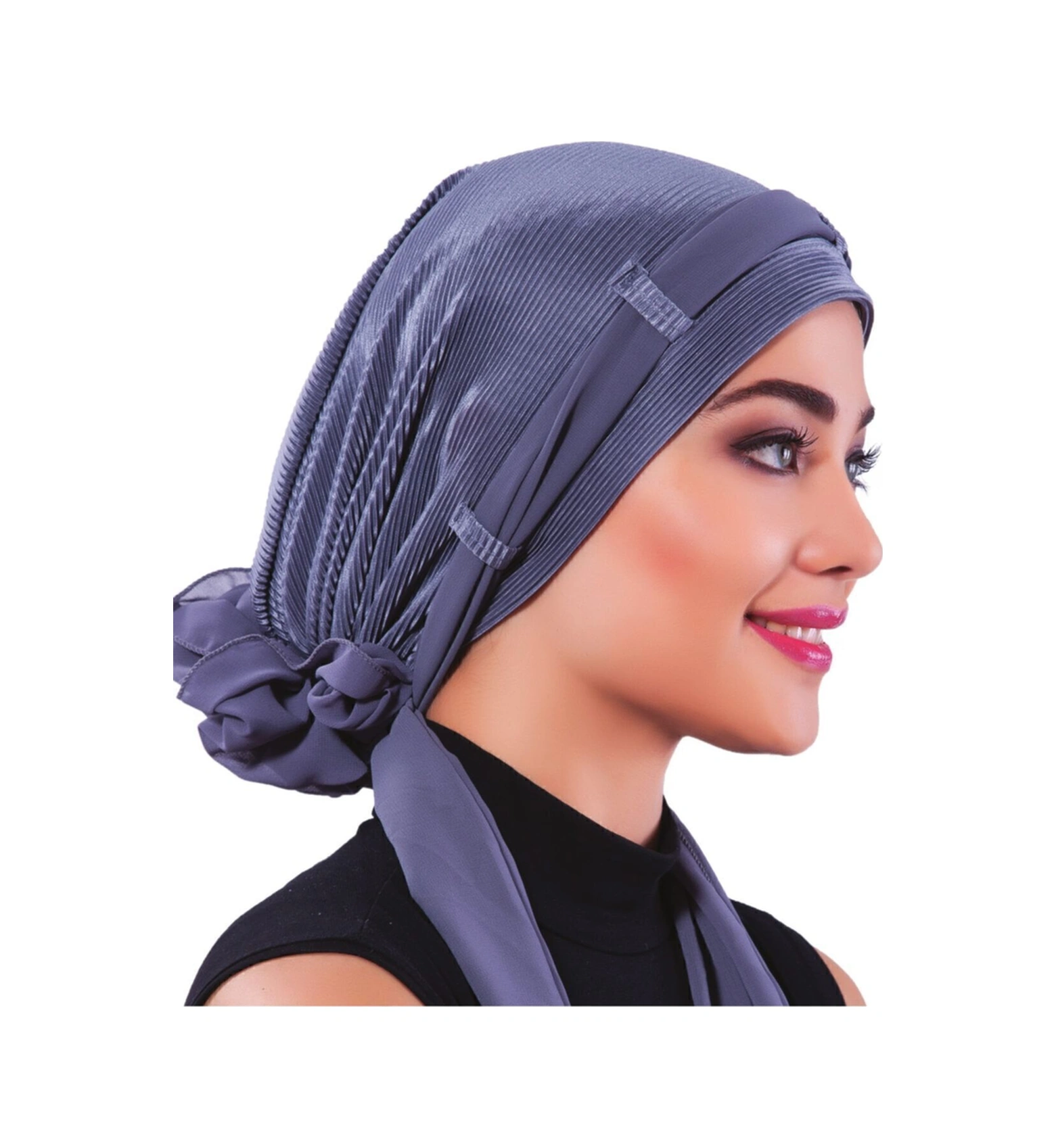 Plise Fularlı Arkası Şifon Incili Çiçek Aksesuarlı Koyu Gri Hazır Türban Tesettür Bone Koyu Gri