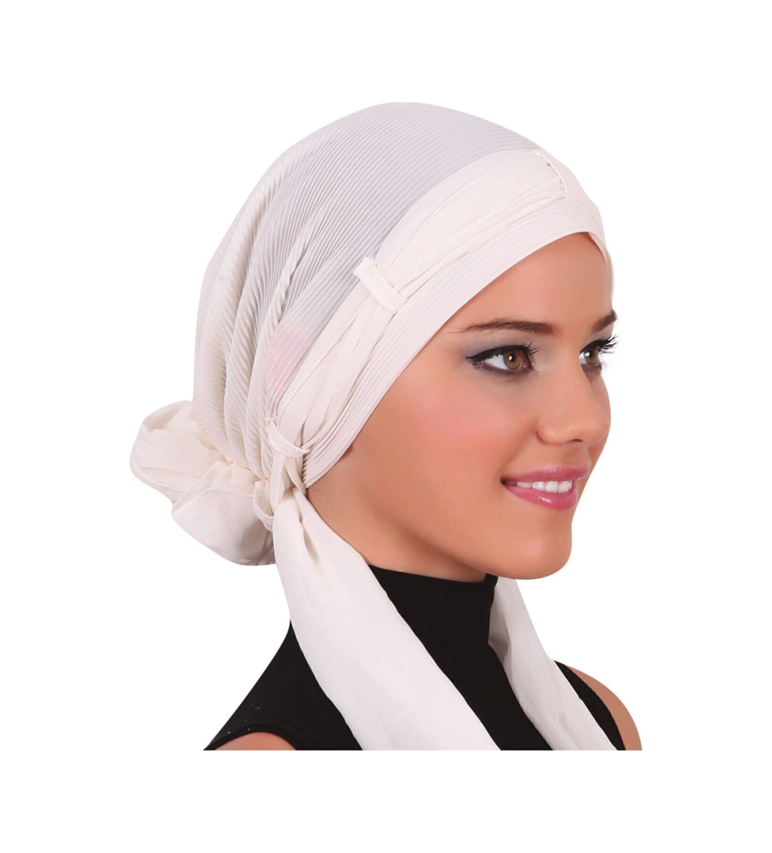 Plise Fularlı Arkası Şifon Incili Çiçek Aksesuarlı Krem Hazır Türban Tesettür Bone Krem