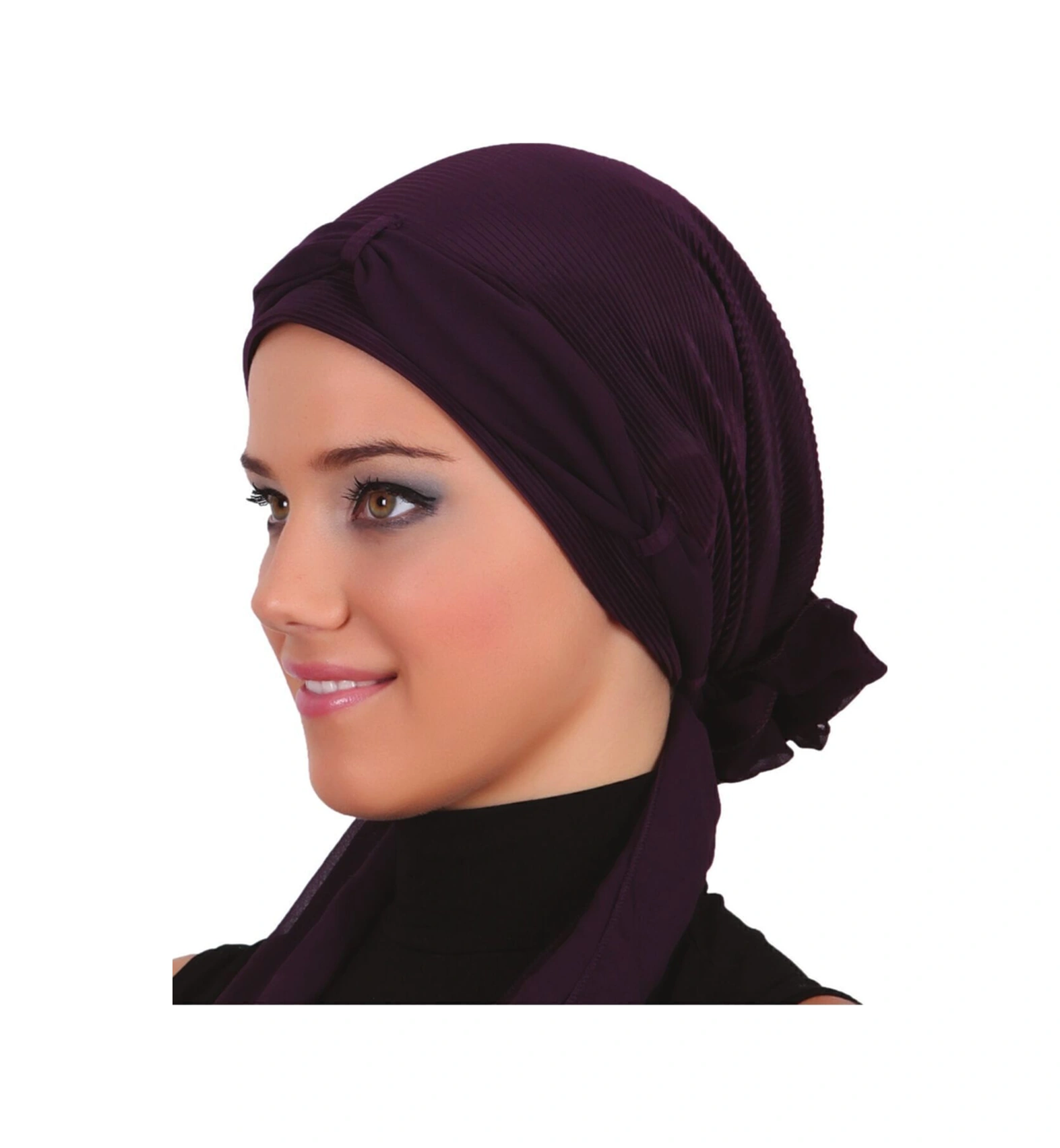 Plise Fularlı Arkası Şifon Incili Çiçek Aksesuarlı Mor Hazır Türban Tesettür Bone Mor