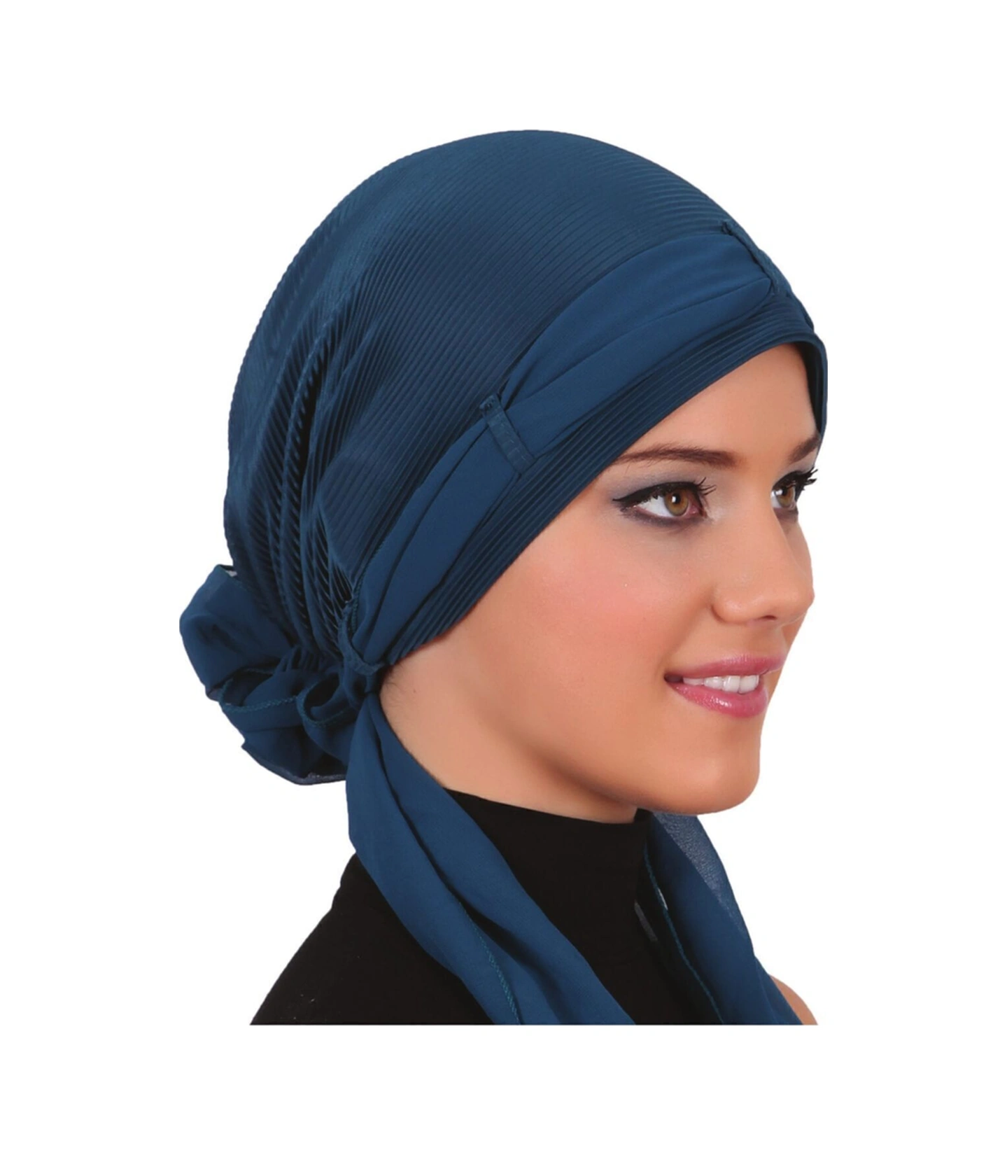 Plise Fularlı Arkası Şifon Incili Çiçek Aksesuarlı Petrol Hazır Türban Tesettür Bone Petrol