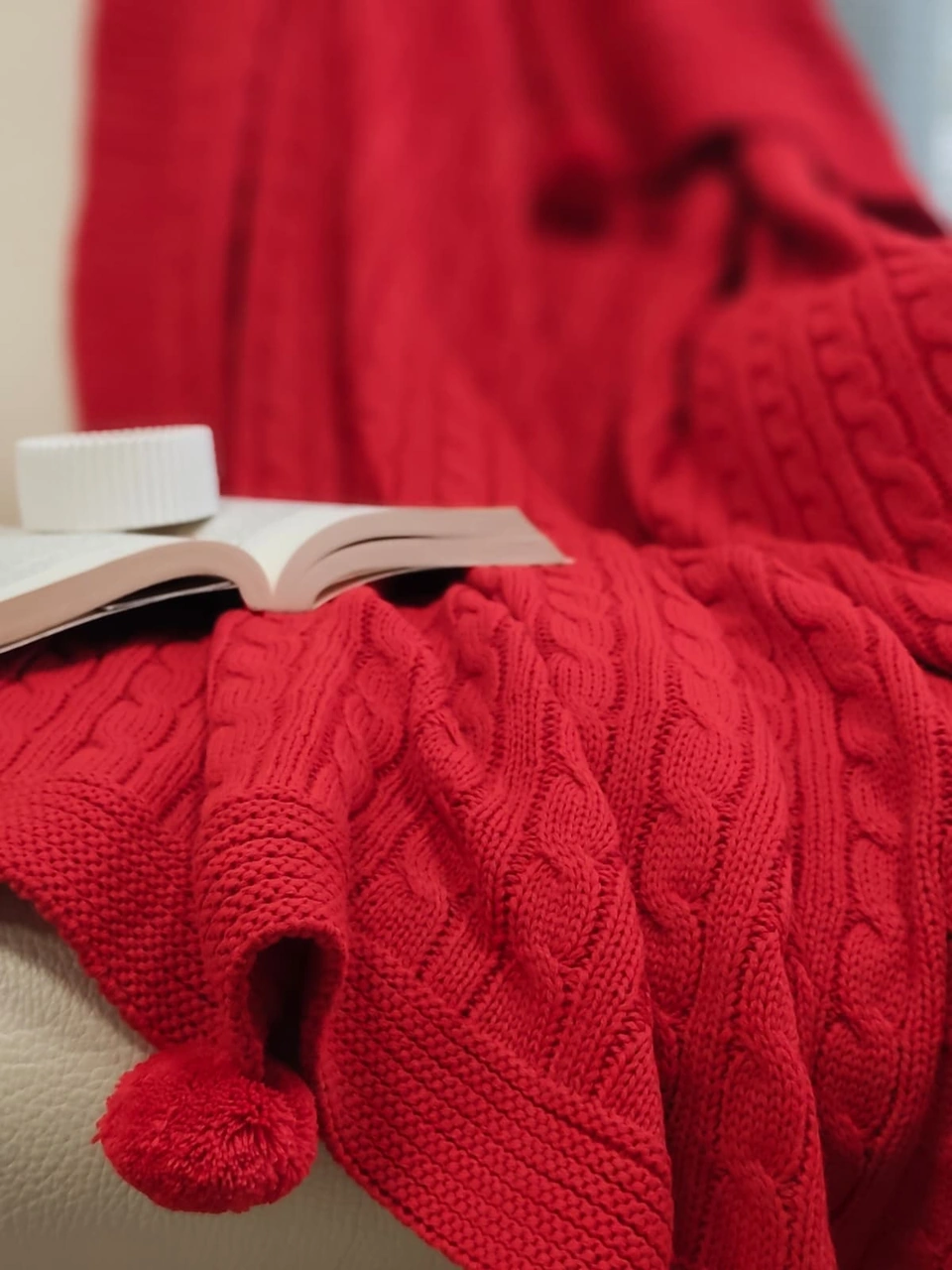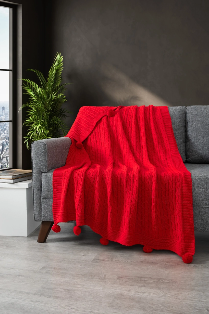 Ponponlu Triko Örgü Battaniye-örgü Koltuk Şalı & Diz Battaniyesi-130x170 Cm Kırmızı Kırmızı