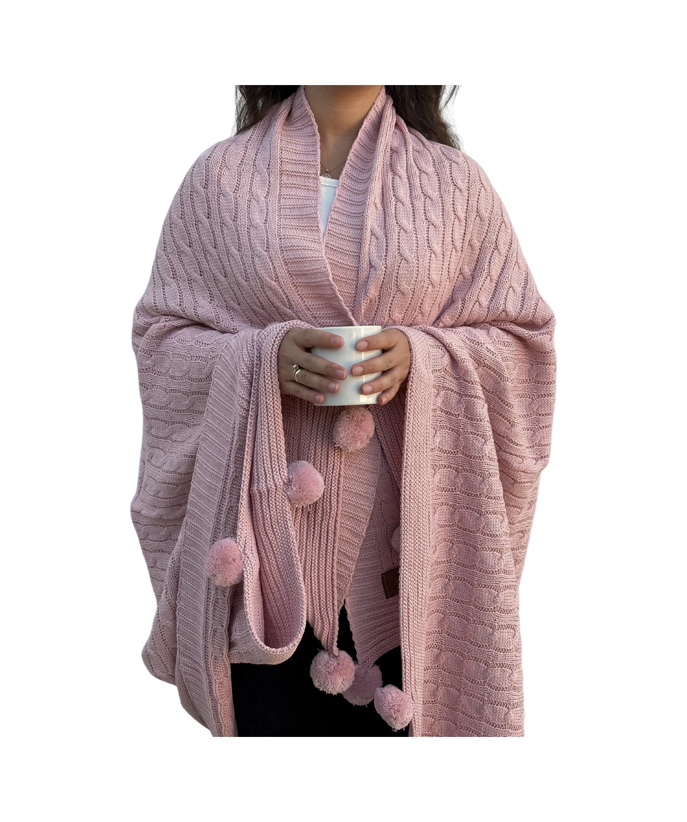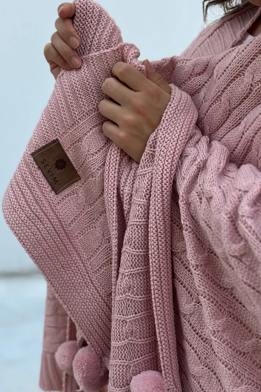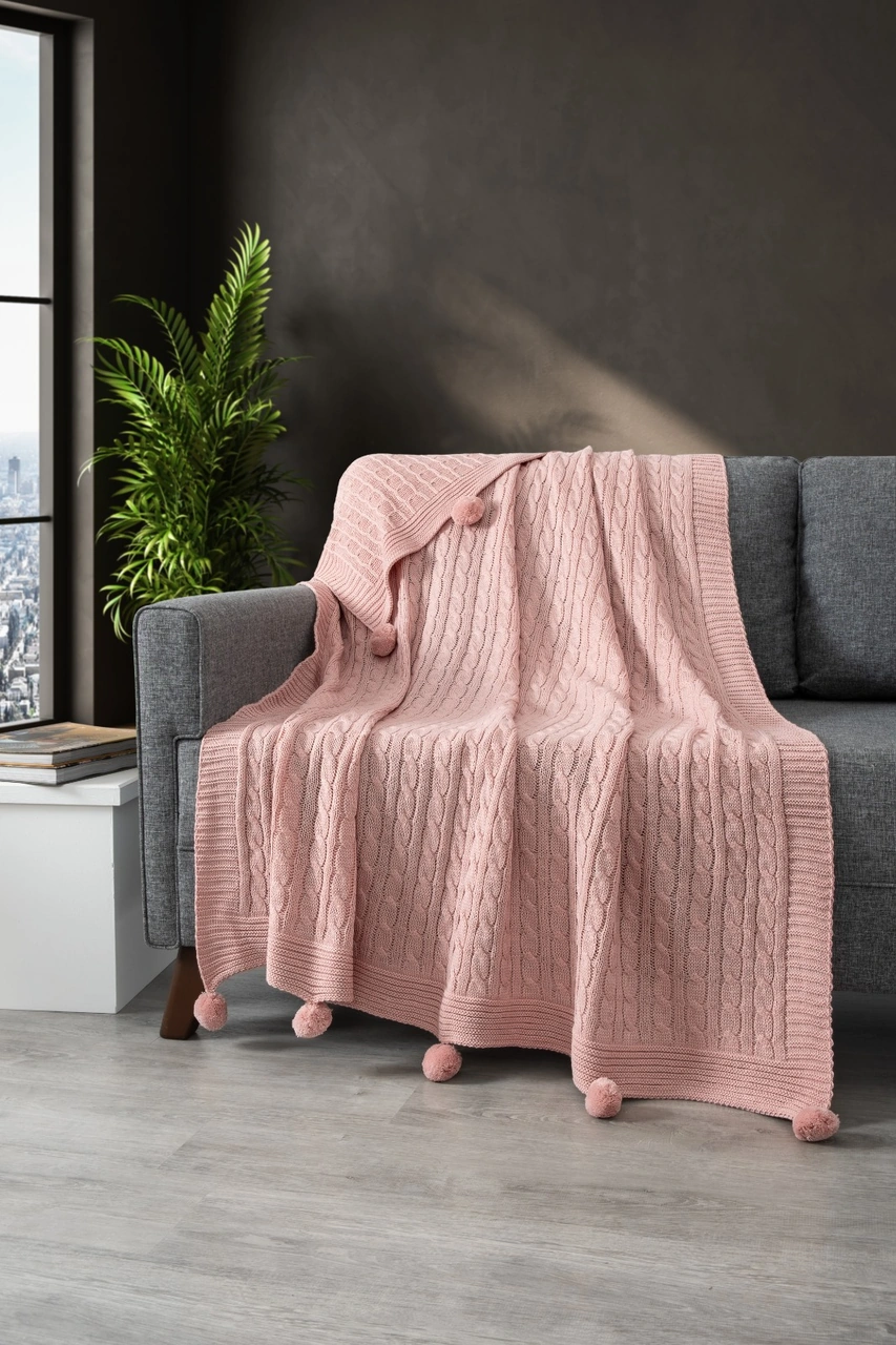 Ponponlu Triko Örme Tv Battaniyesi Örgü Koltuk & Omuz Şalı & Diz Battaniyesi 130x170 Cm-pudra Pudra Pudra