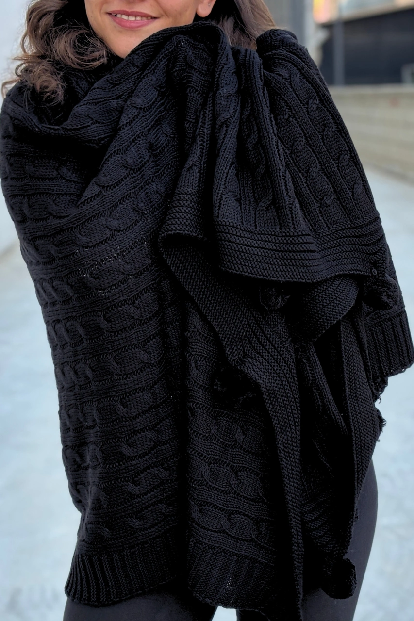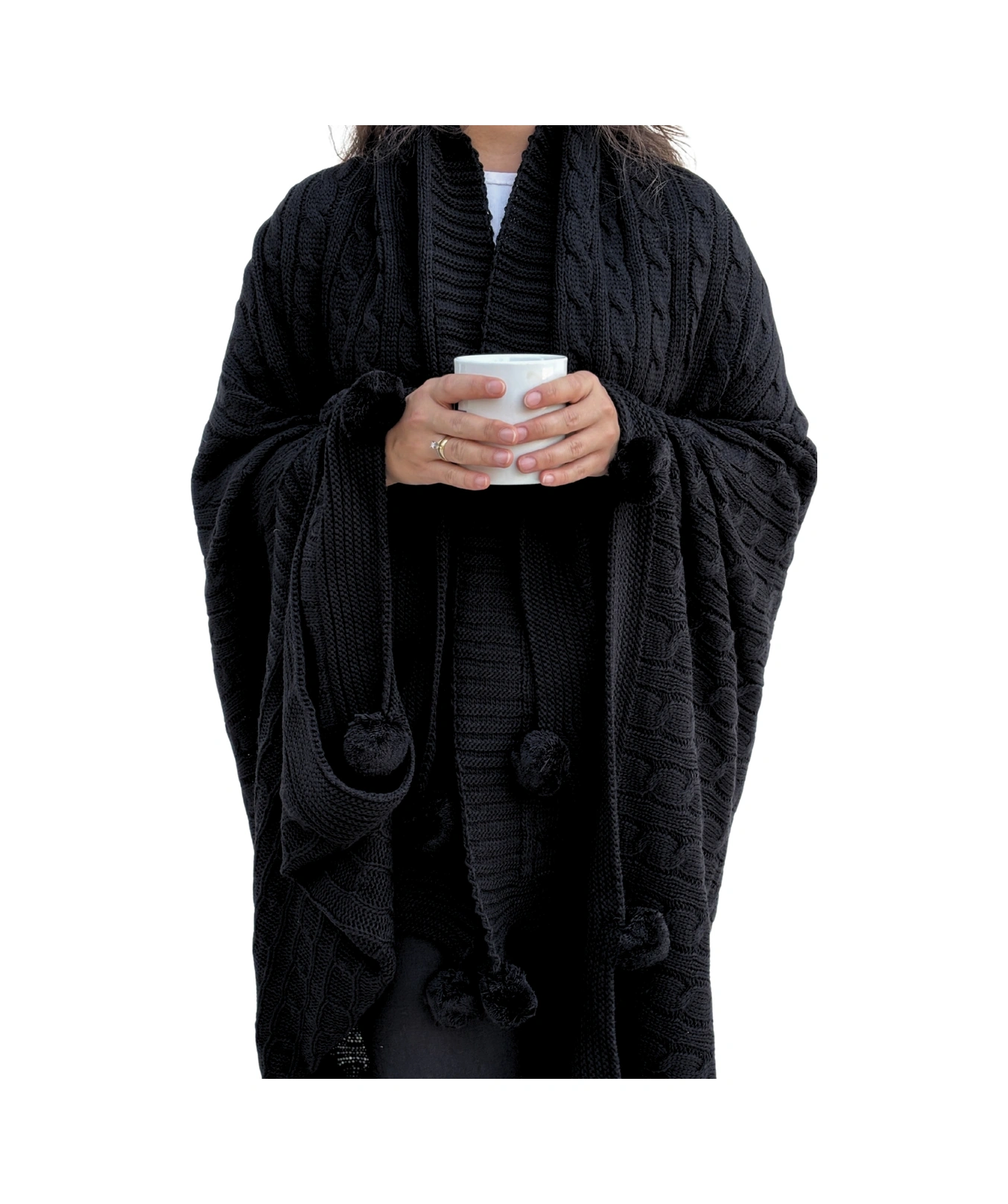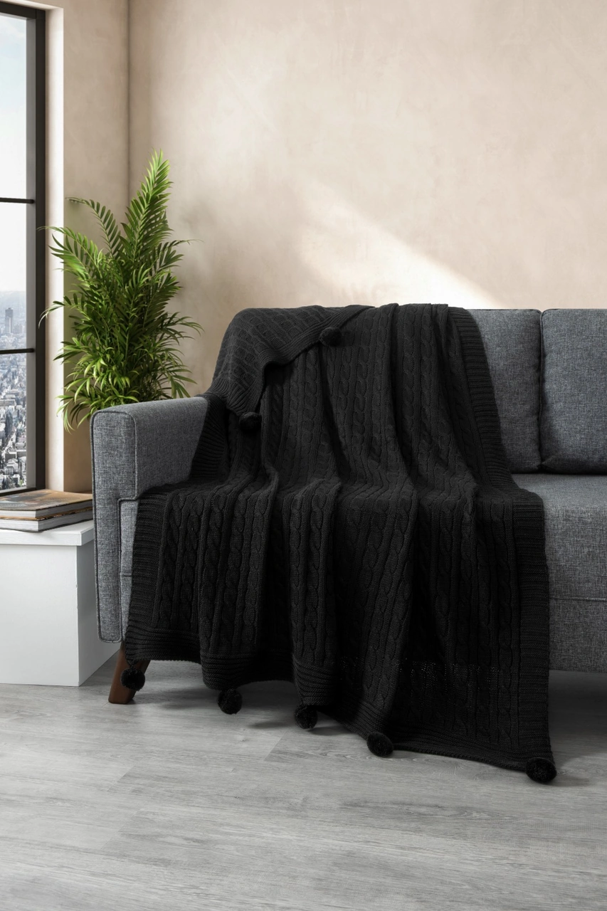 Ponponlu Triko Örme Tv Battaniyesi Örgü Koltuk & Omuz Şalı & Diz Battaniyesi 130x170 Cm-siyah Sıyah Siyah