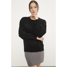 Prenses Kol Örgü Detaylı Triko Kazak - Siyah 001