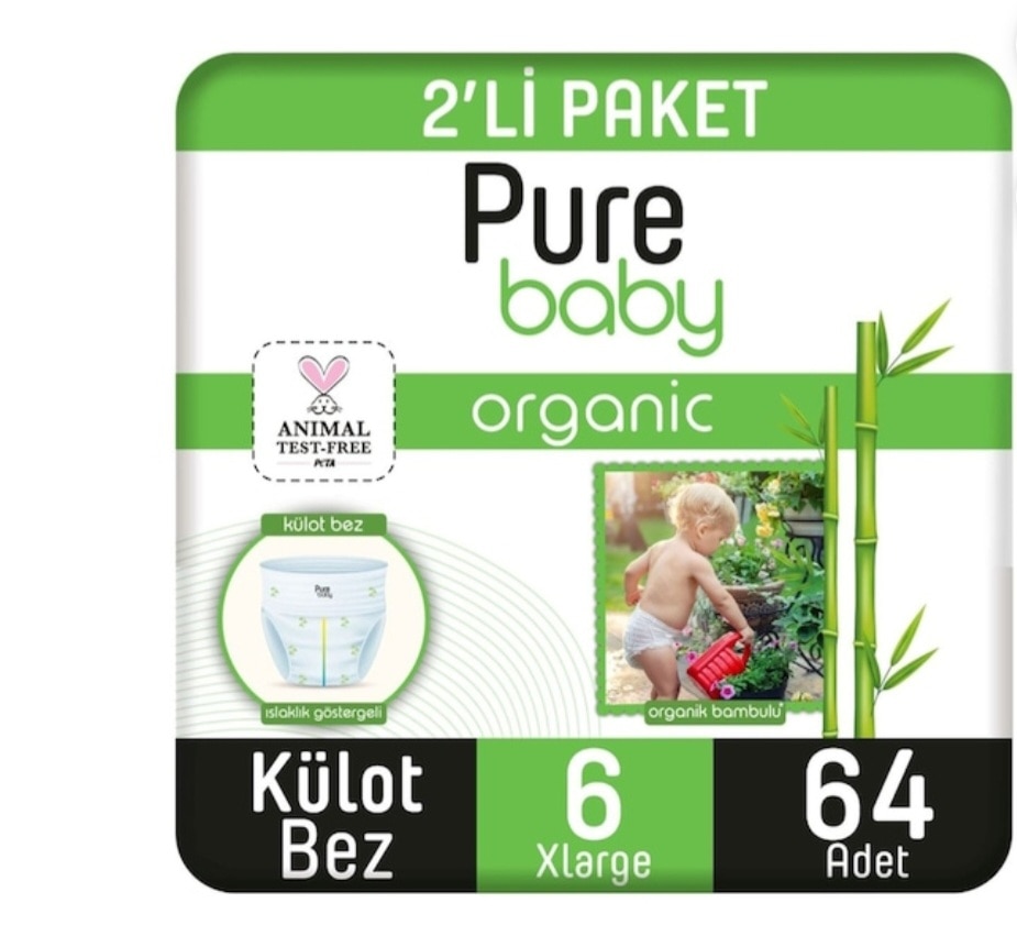 Pure Baby Organik Bambu Özlü Külot Bez 2'li Paket 6 Numara Xlarge 64 Adet 2'li