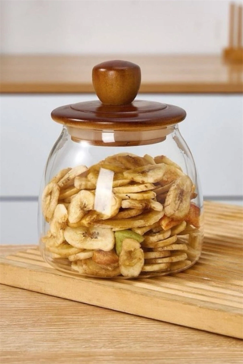 Qerhome 3'lü Akasya Kapaklı Herry Borosilikat Konik Cam Kavanoz 500 -700-950 Ml Şeffaf