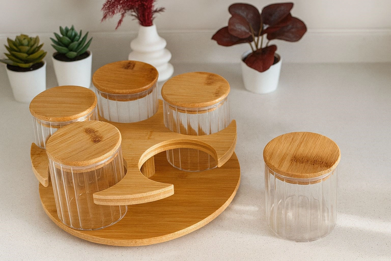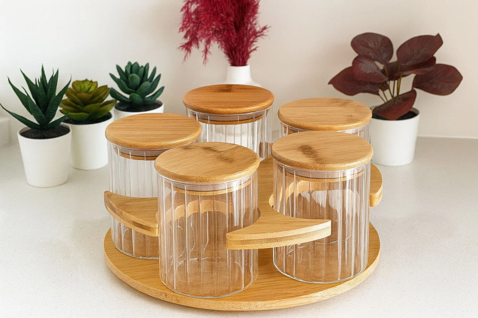 Qerhome Borosilikat Cam Bambu Standlı 360 Derece Dönerli 5'li Baharatlık Seti 390 Mlx5 Alg Beyaz